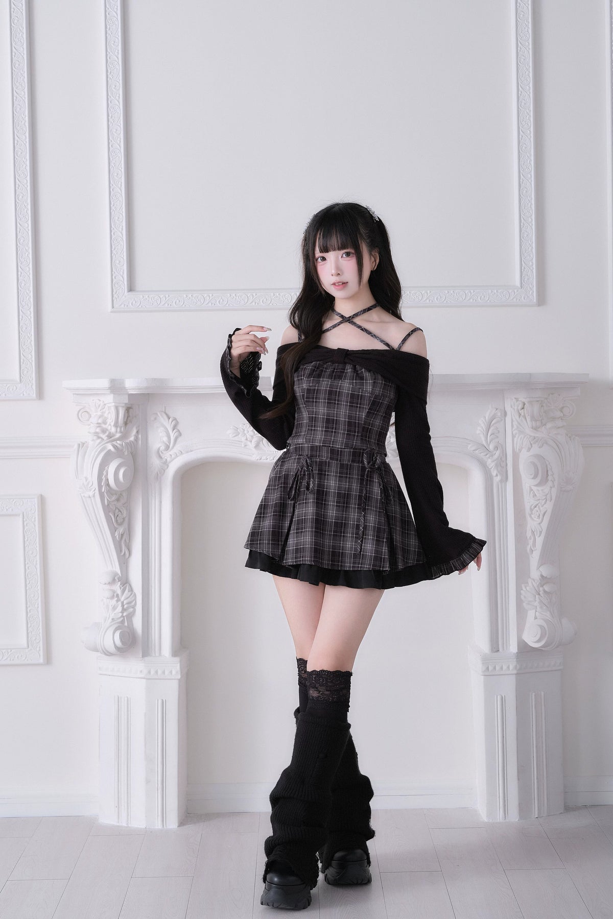 Jirai Kei Plaid Top and Skirt Set, Halter Neckline (Gray / M S) 44814:822663