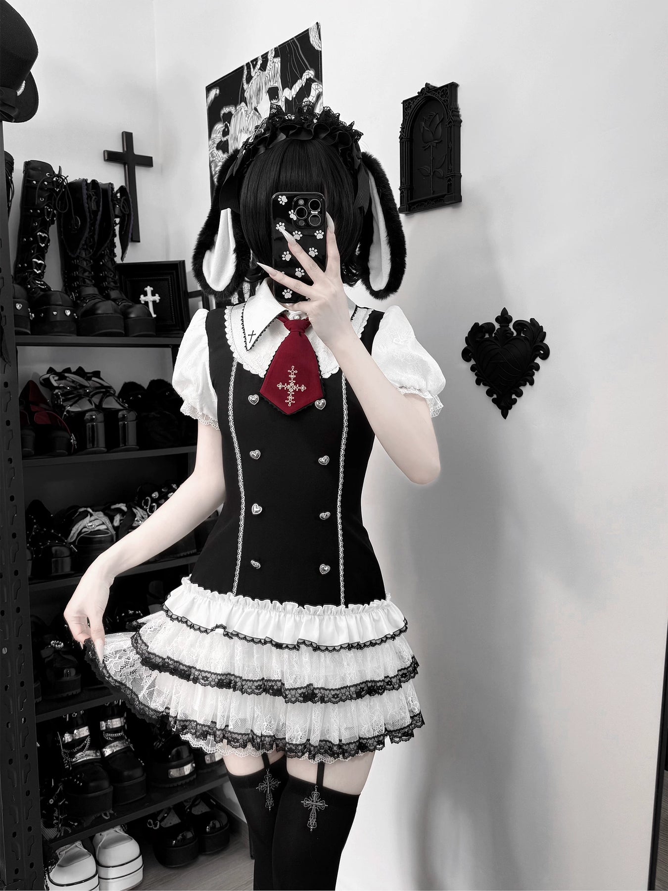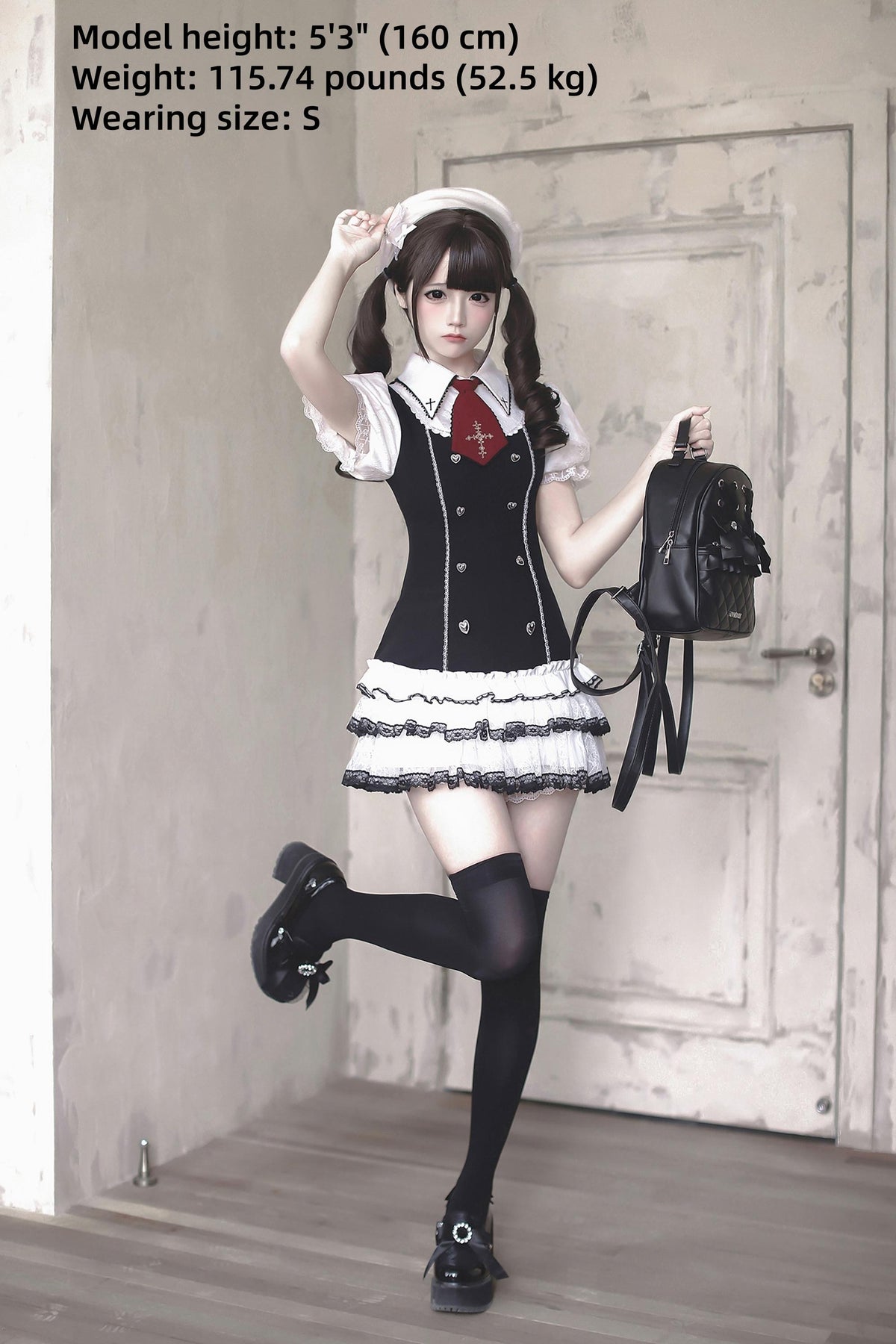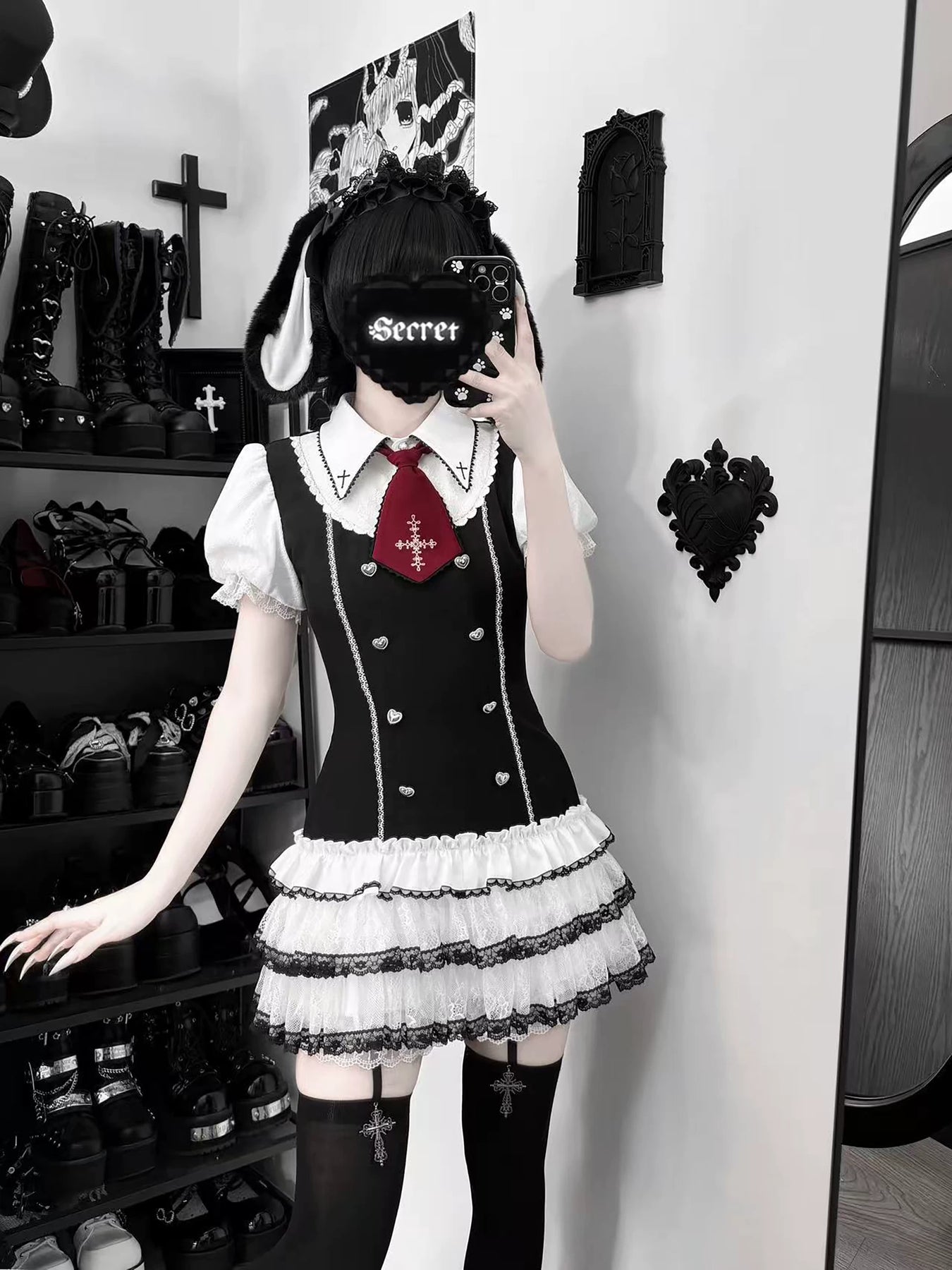 • Preppy Style Outfit: Red tie with cross embroidery, paired with lace and heart buttons, very delicate.