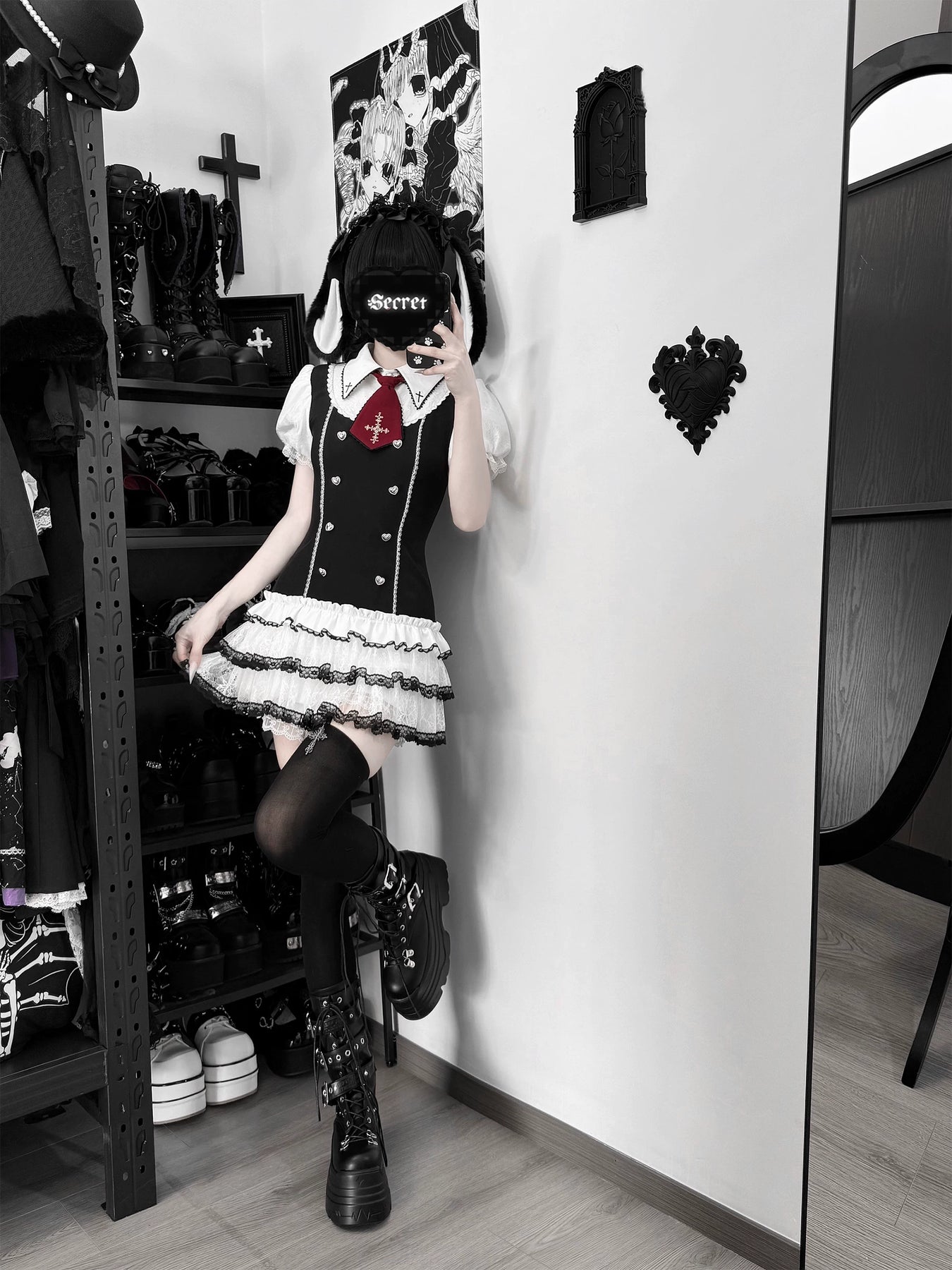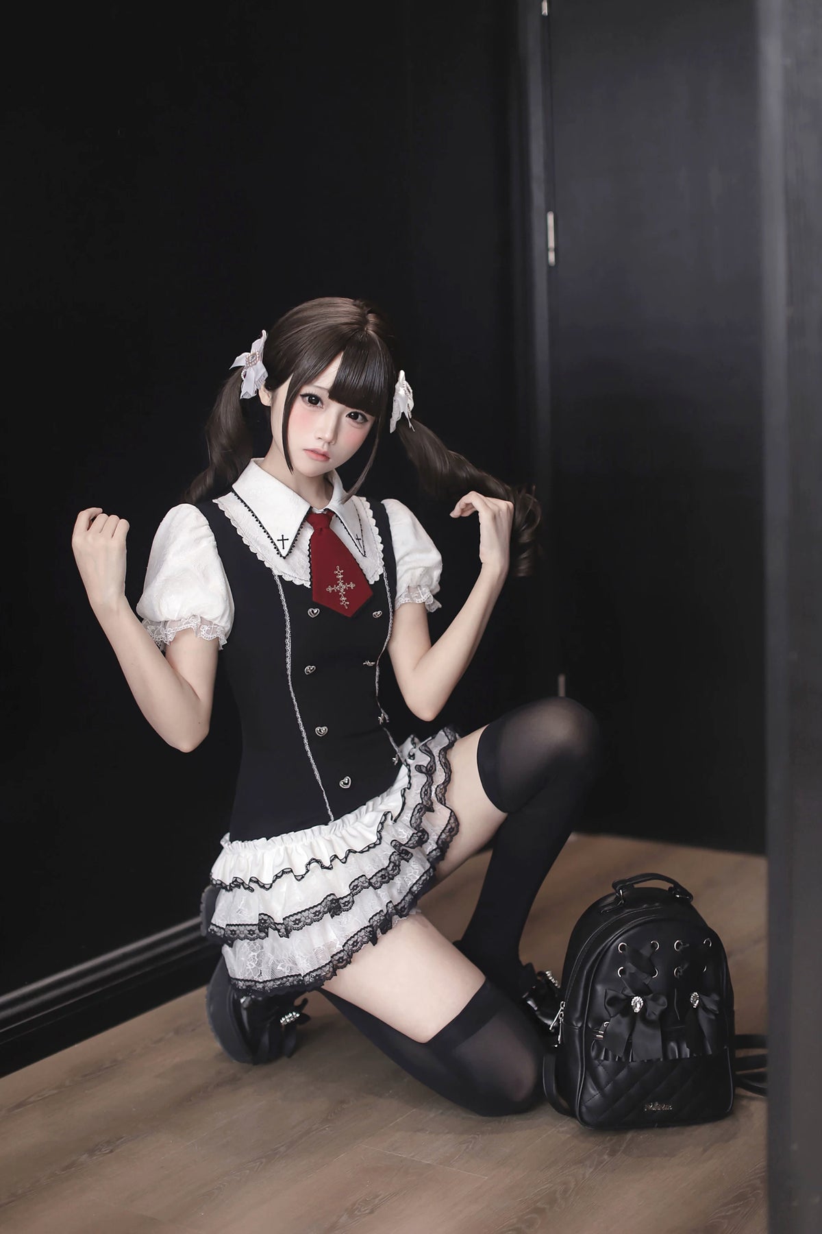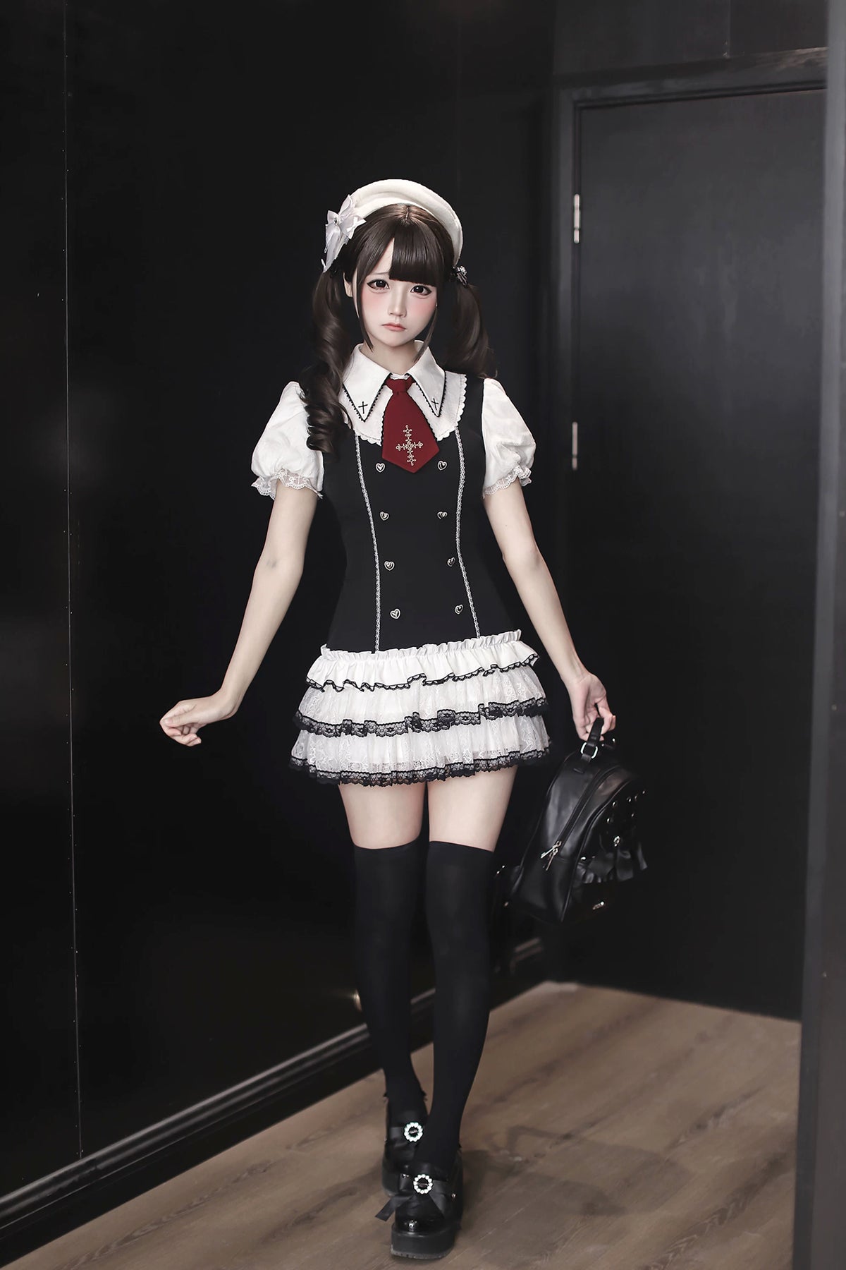 • Preppy Style Outfit: Red tie with cross embroidery, paired with lace and heart buttons, very delicate.