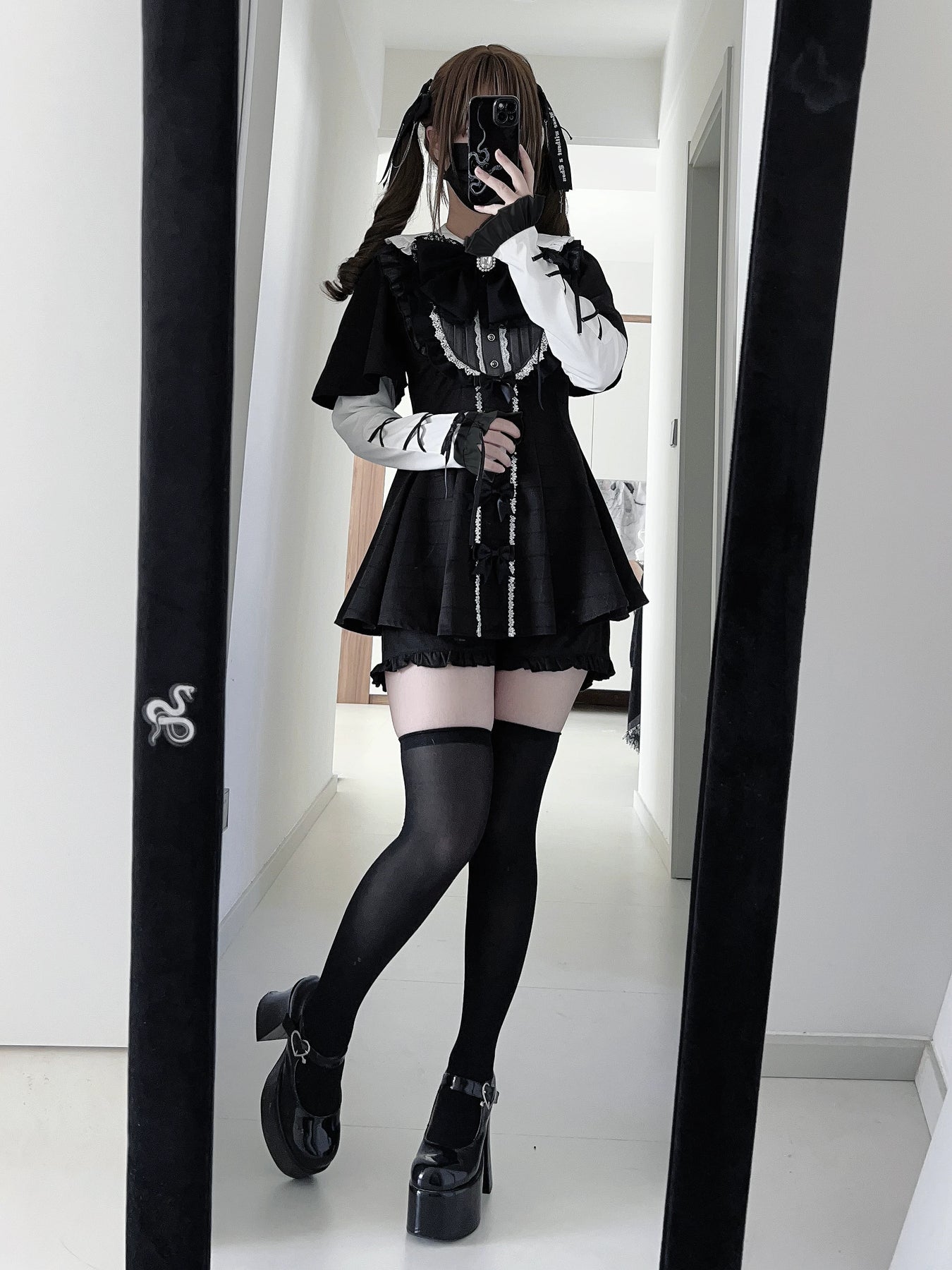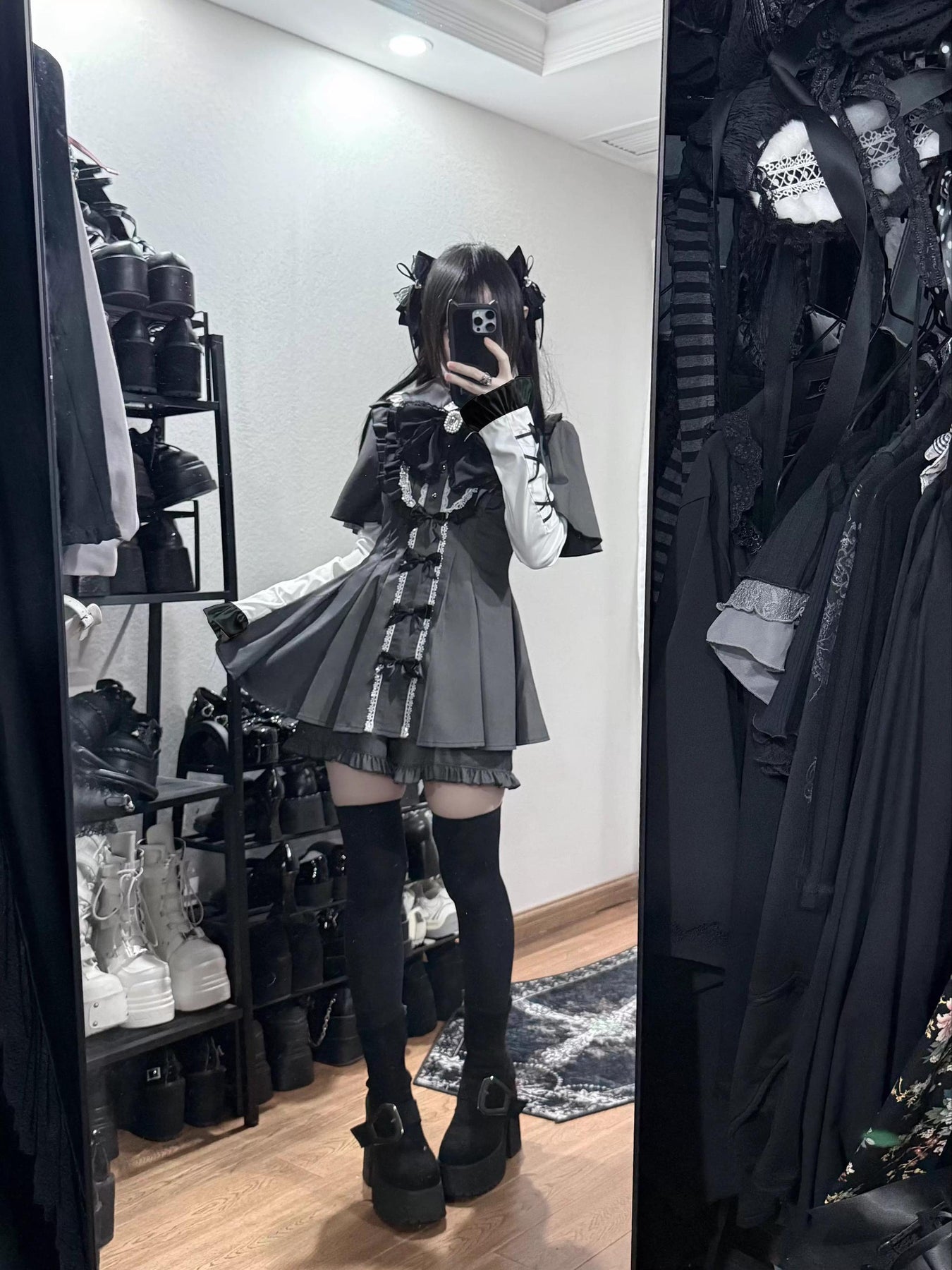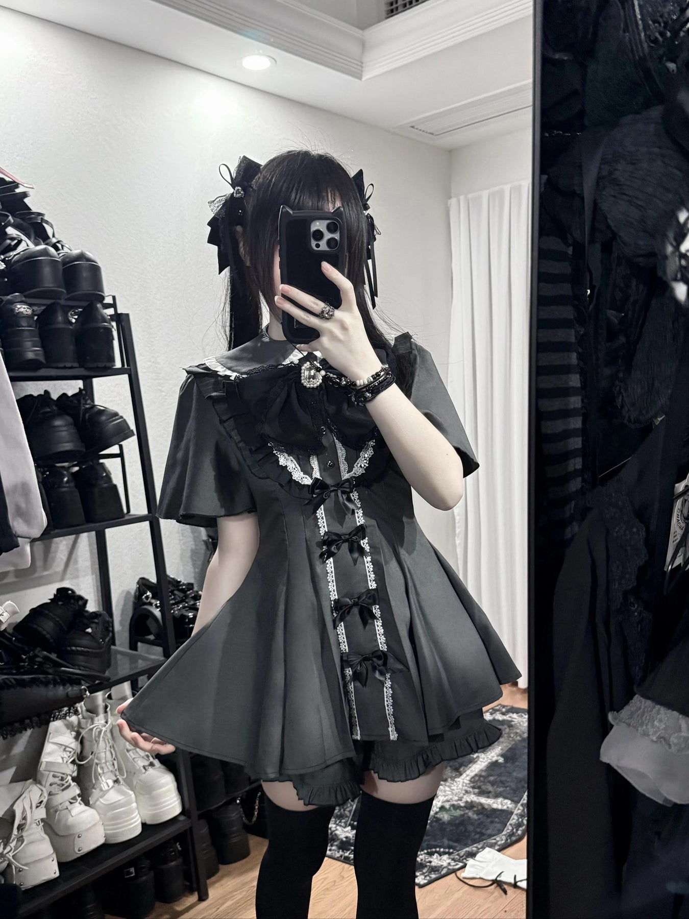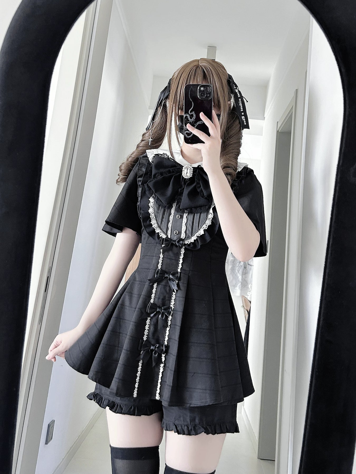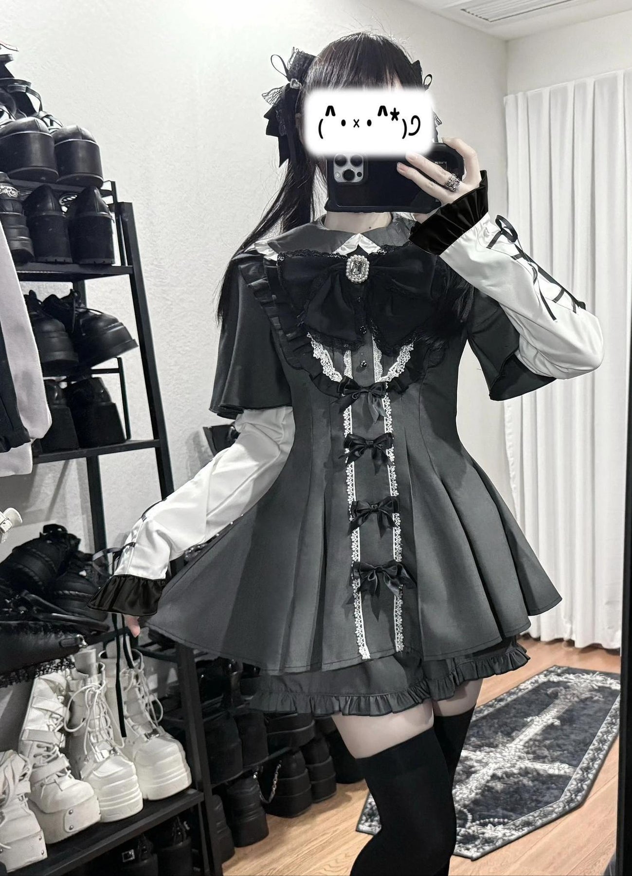 • Jirai Kei Dress: Ruffled Peter Pan collar adds cuteness. Lace trim, detachable rhinestone bow tie, and small bow details adorn the dress.