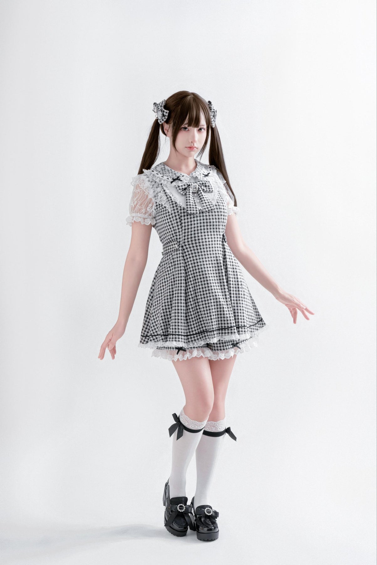 Jirai Kei Plaid Dress Set, Rhinestone Collar Bow 45008:837300