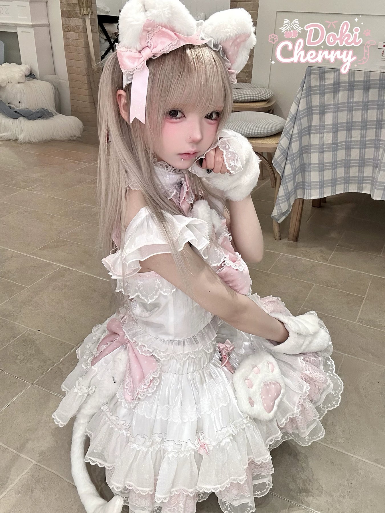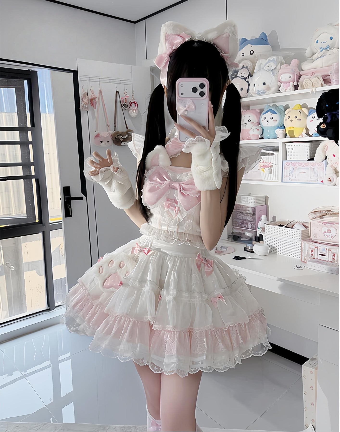 • Kawaii Lolita skirt set, with plush cat ears and polka dot bows, plus just the right amount of skin shown, cute and sexy.