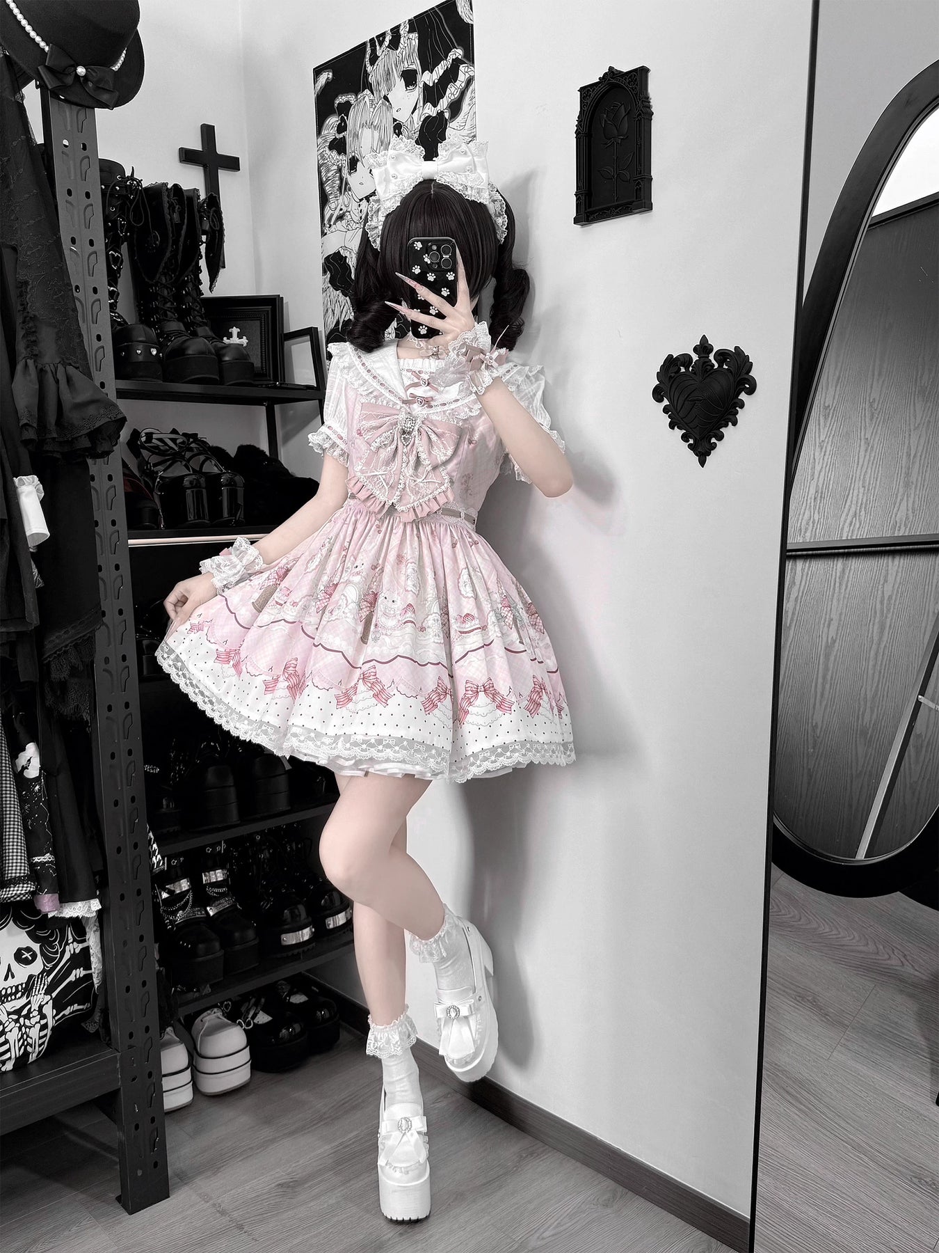• Pullover design. Recommend the full set that includes accessories like a choker and cuffs, to get a richly layered, sweet girl look.