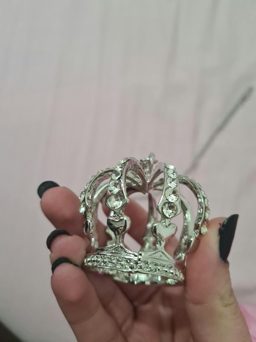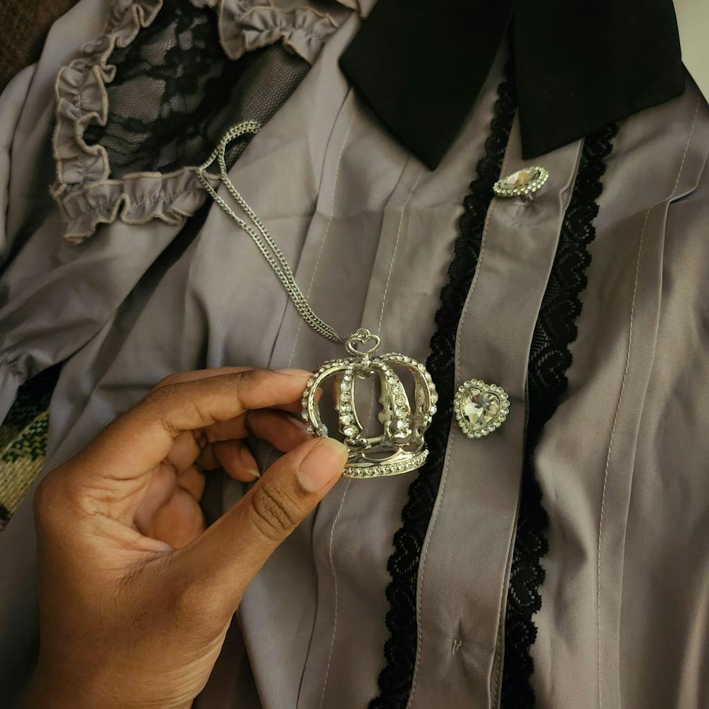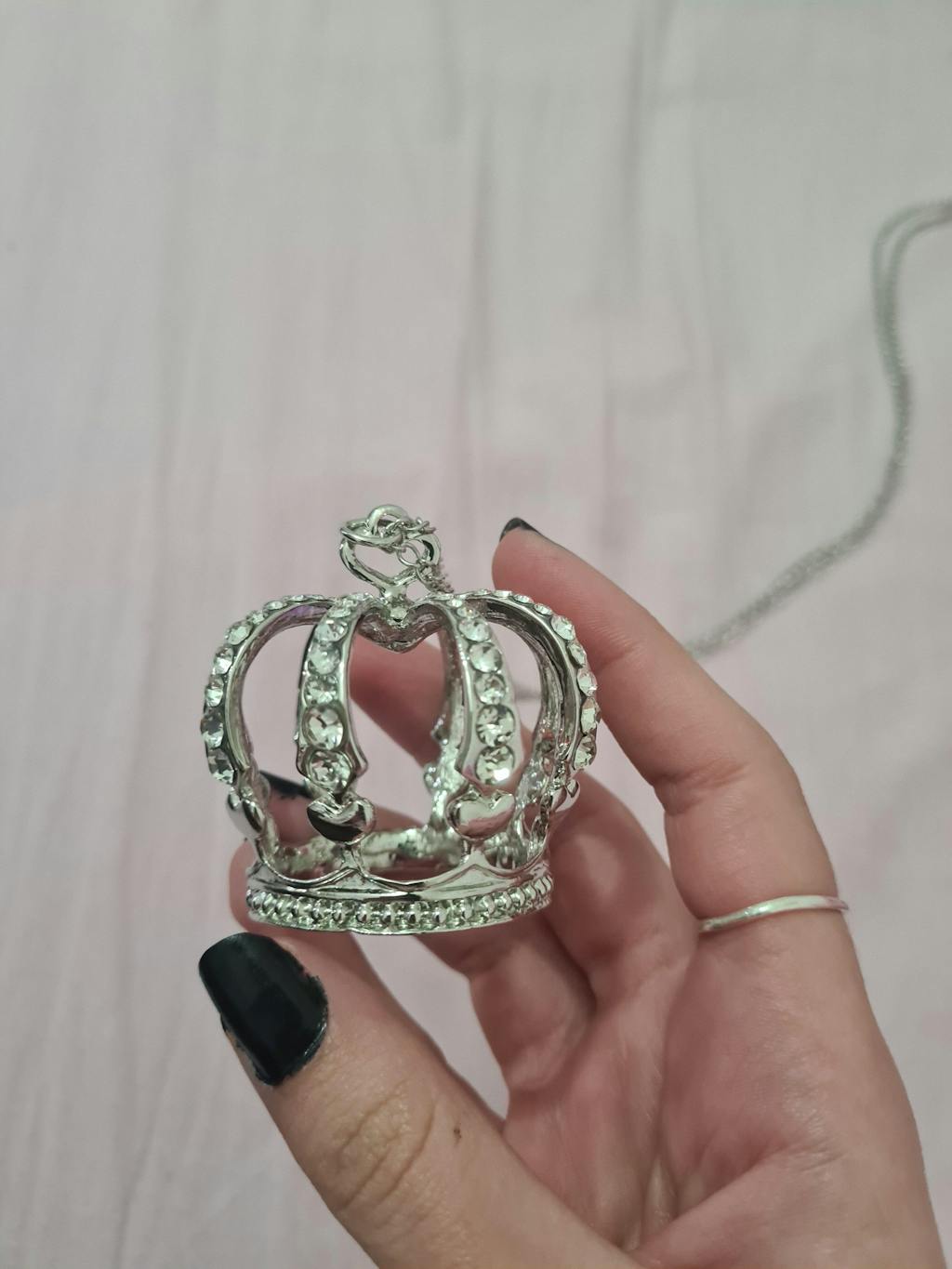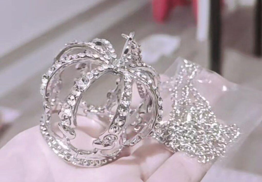 - The pendant features a three-dimensional crown adorned with rhinestones.