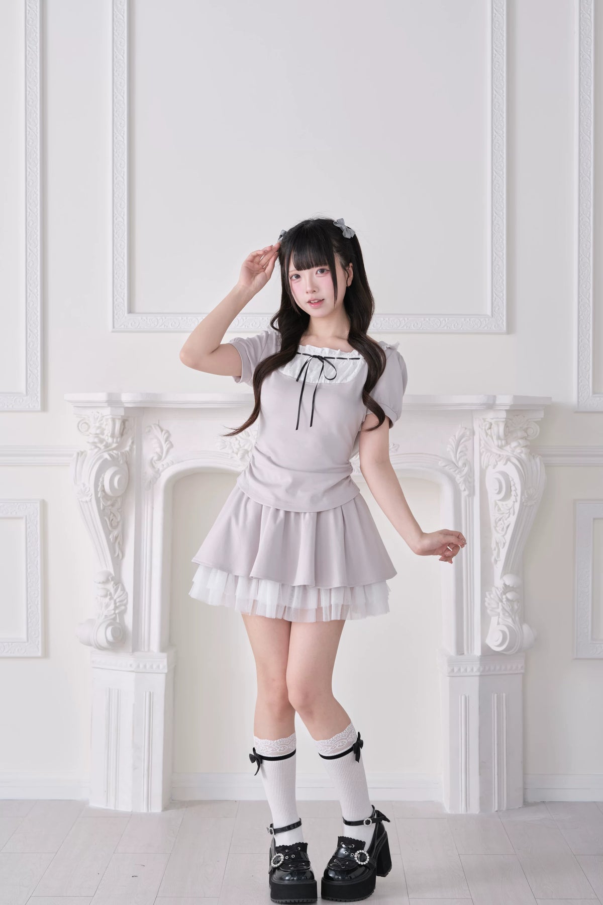Jirai Kei Hoodie Top & Skirt Set, Tulle Hem (Gray / M S) 44941:829948