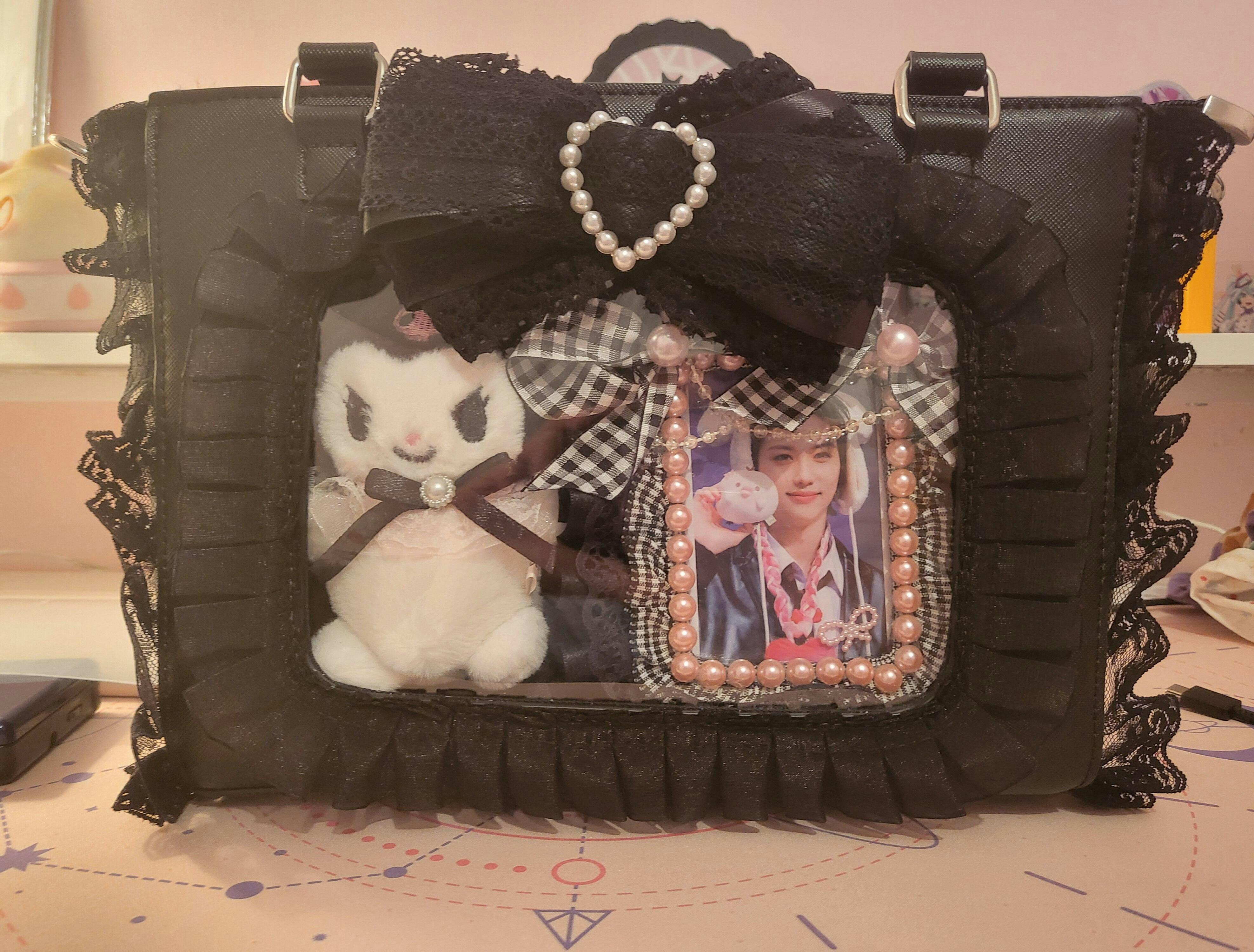 • This Kawaii Itabag is adorned with ruffle trim and a charming bow decoration on the front, also features a transparent window perfect for displaying badges or other small items.