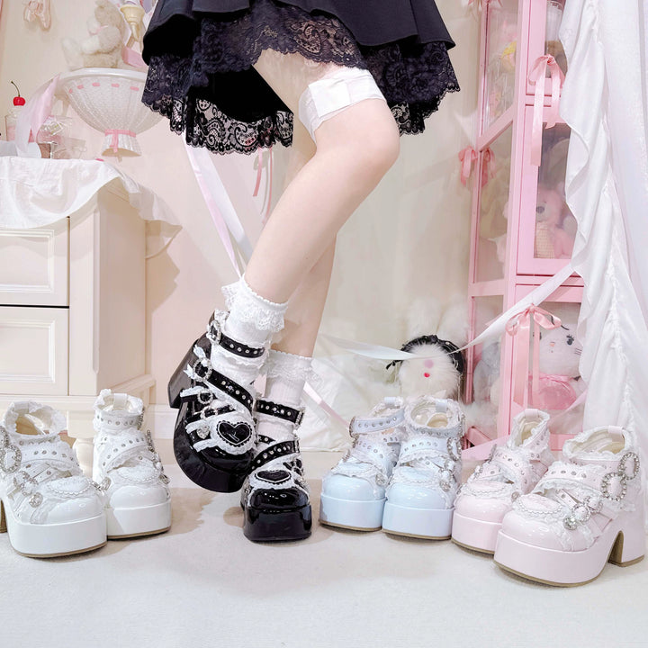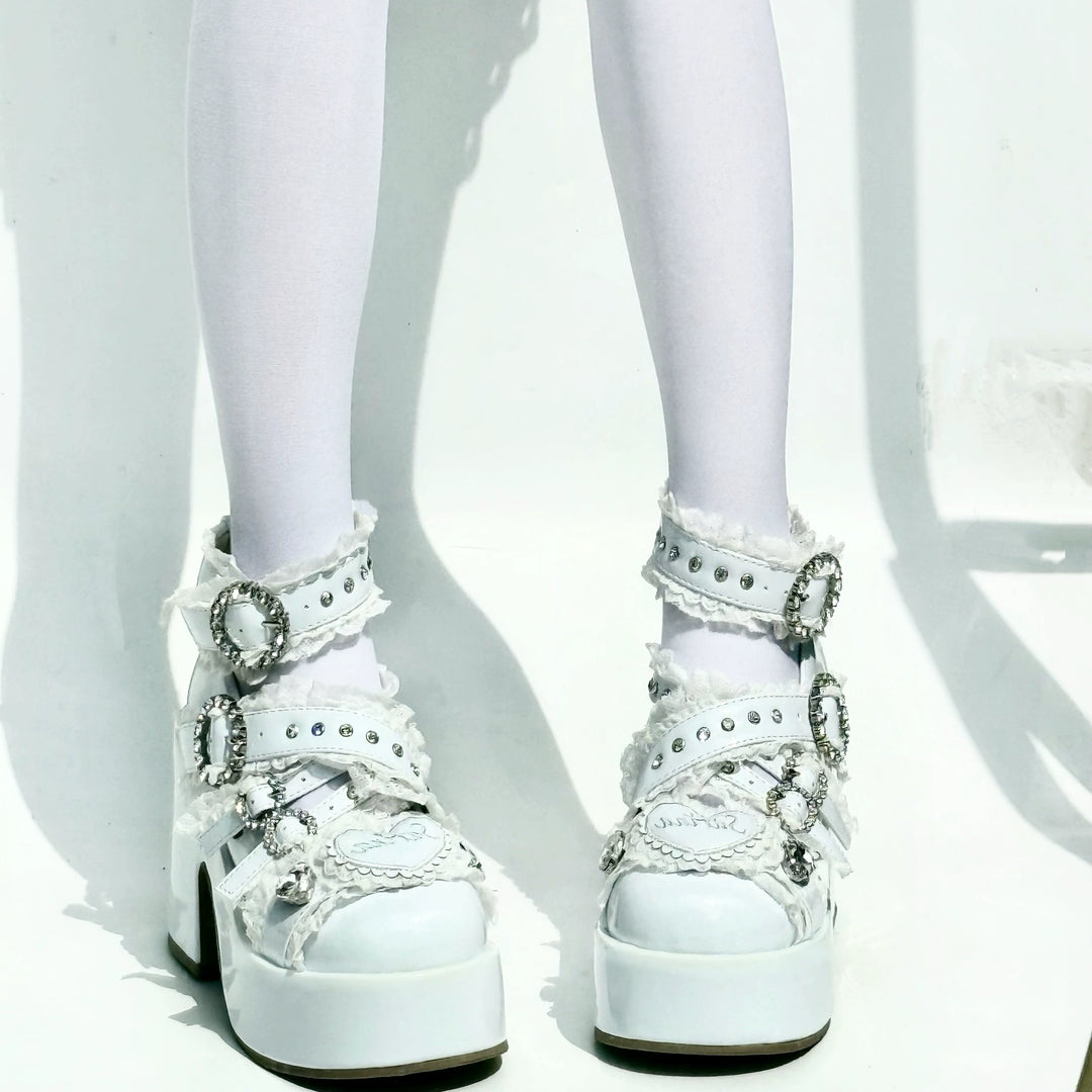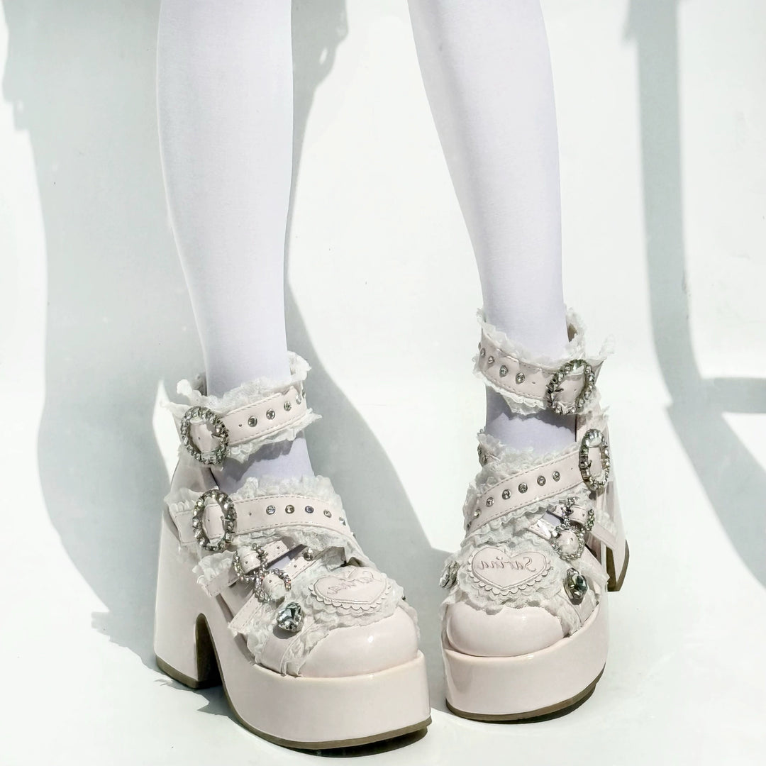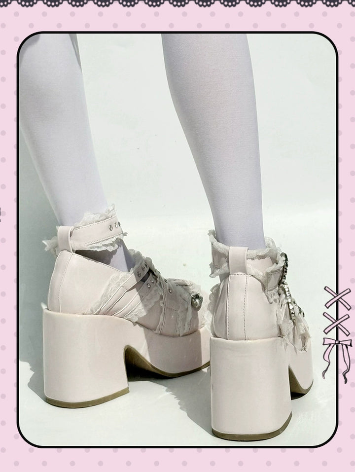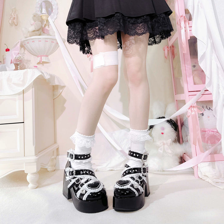 Jirai Kei High-Heeled Platform Shoes, Ruffled Lace