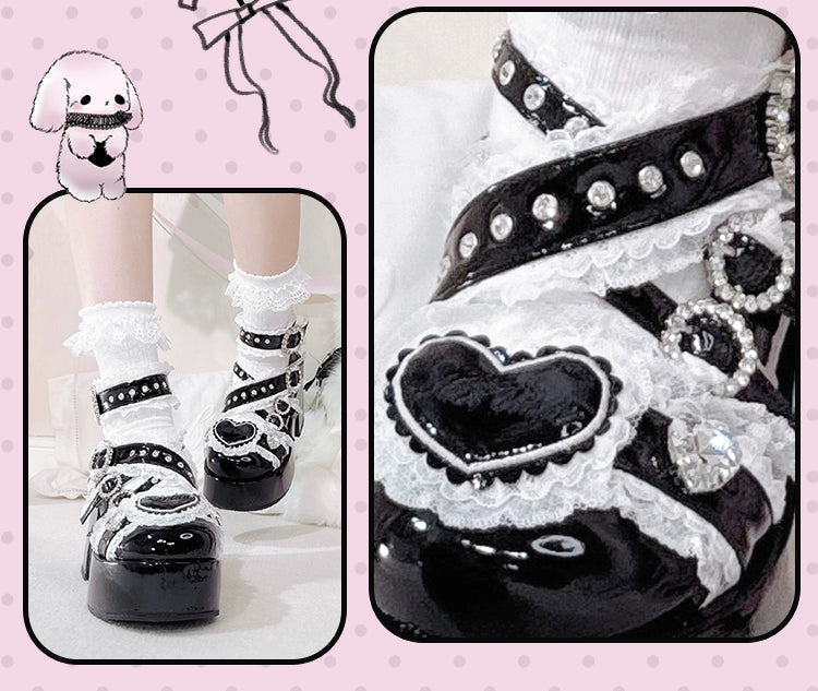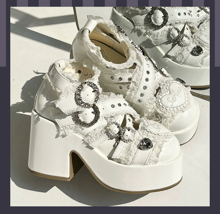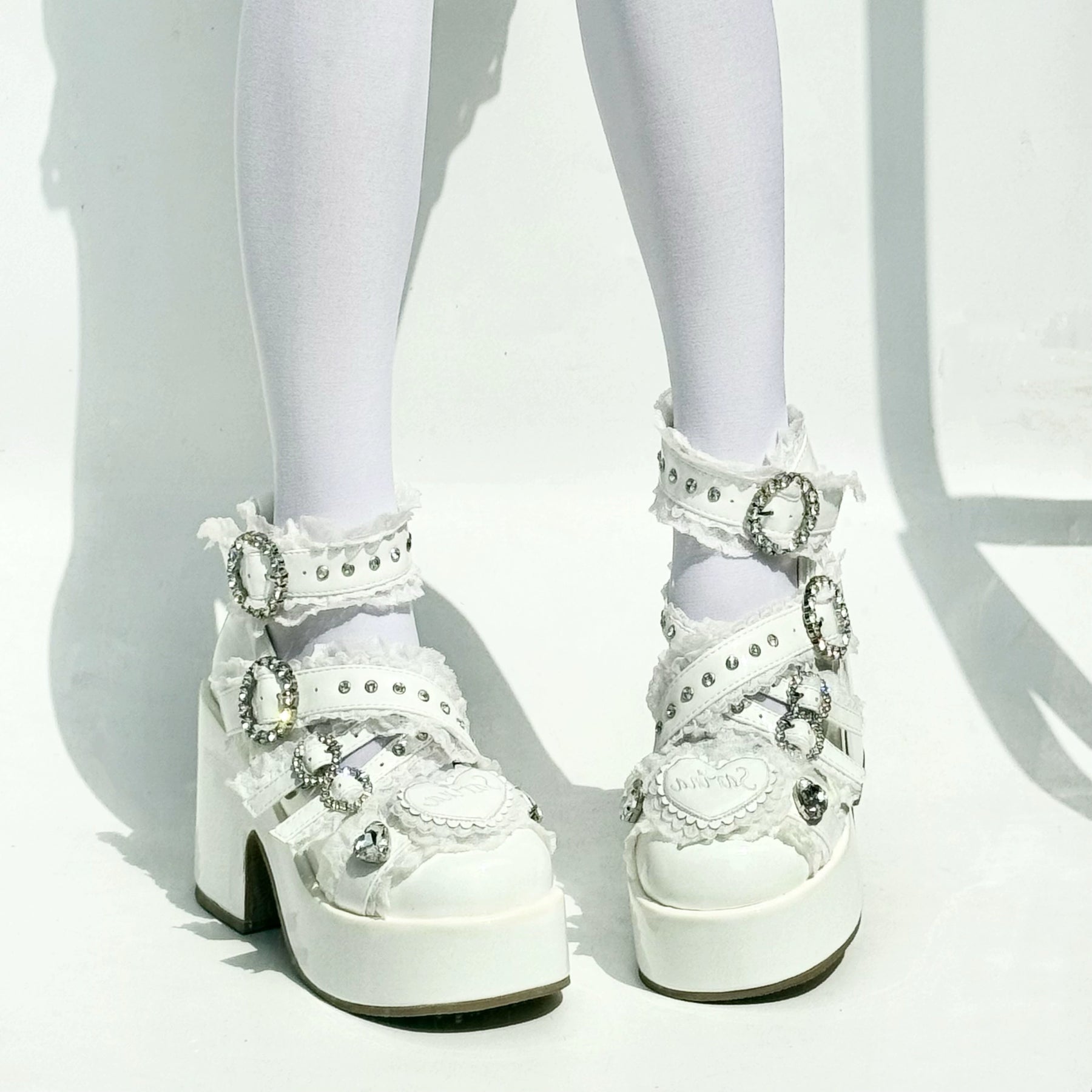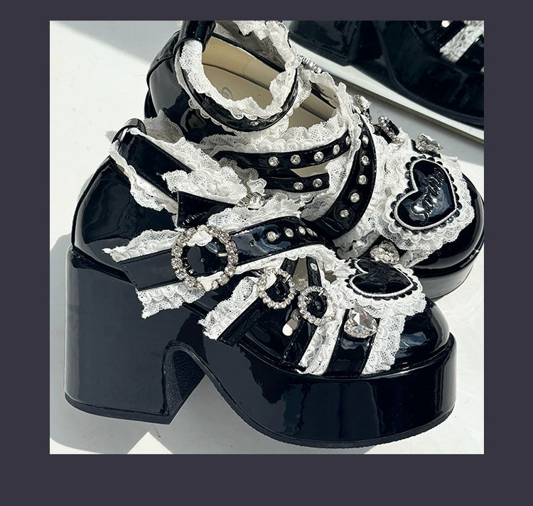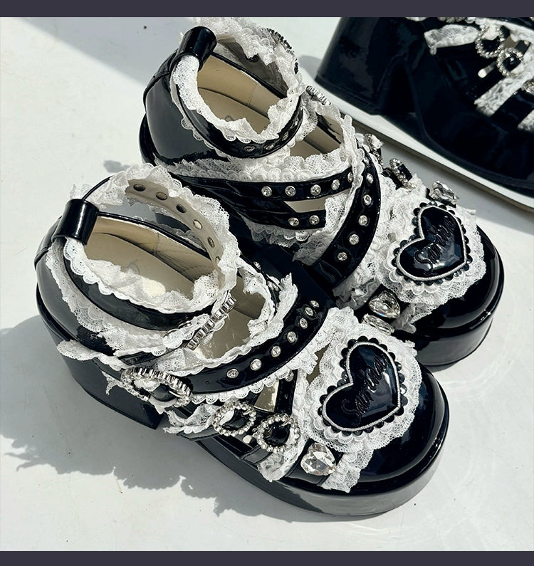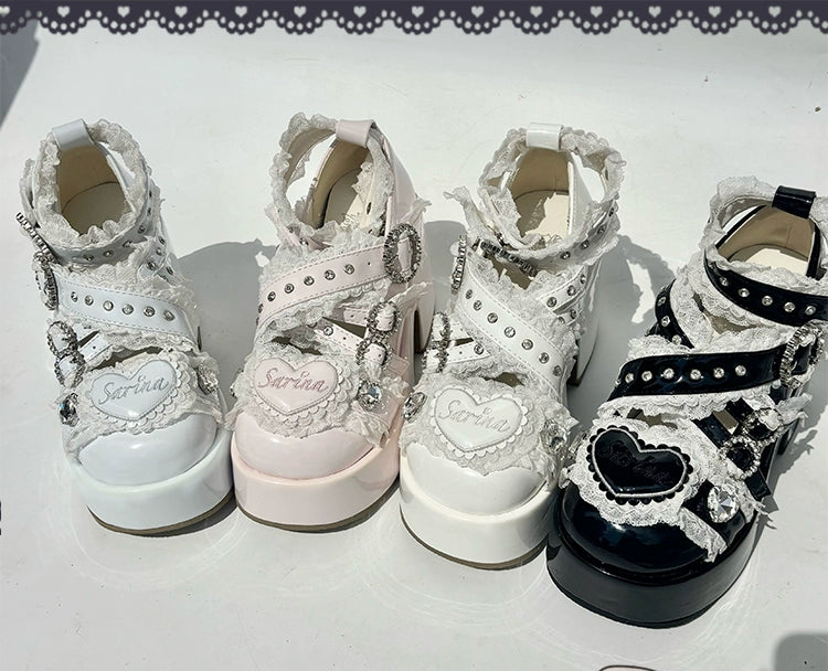 Jirai Kei High-Heeled Platform Shoes, Ruffled Lace