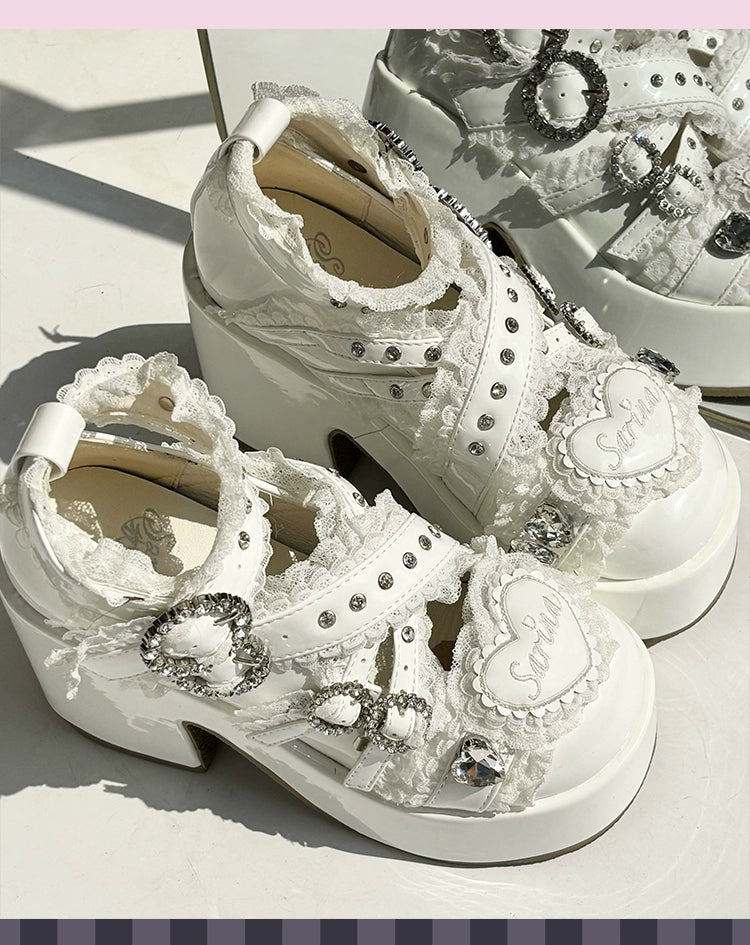 • Sweet details: Rhinestone decorations; ruffled lace trim; heart-shaped decoration on the toe with brand embroidery.