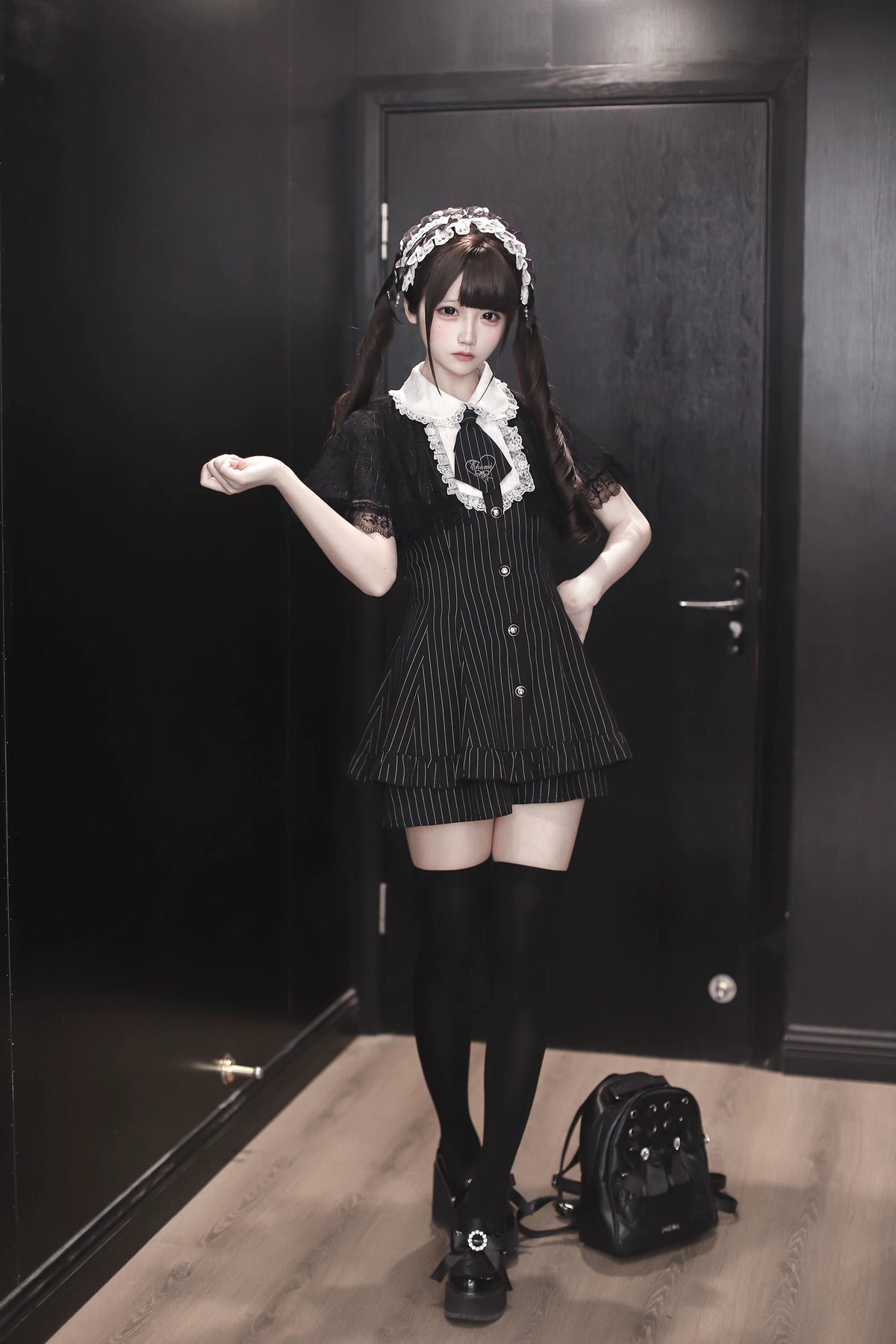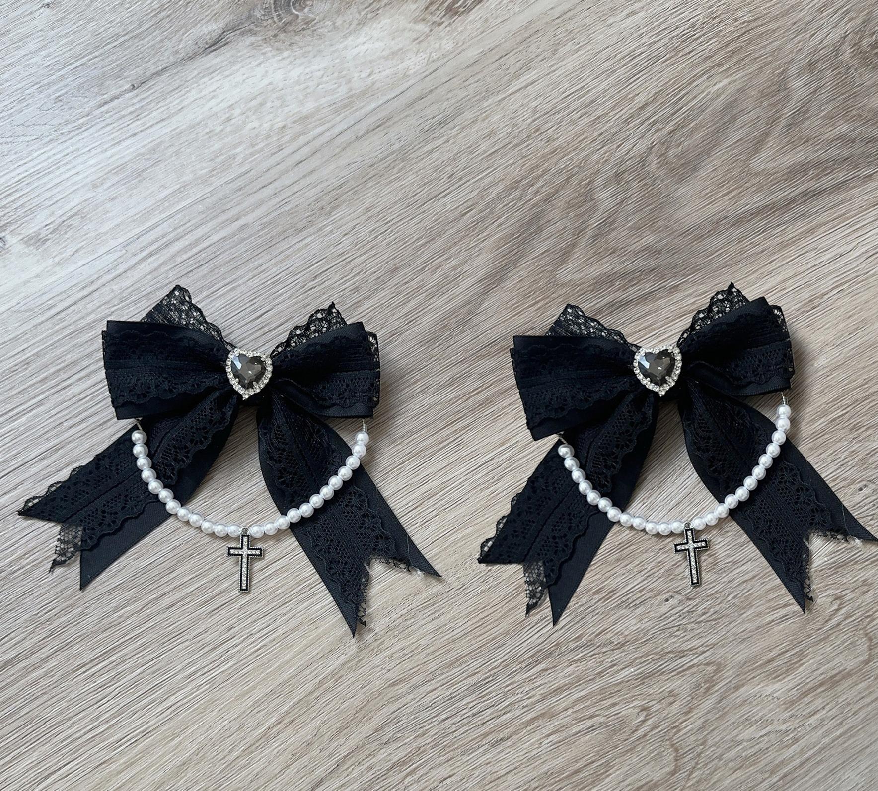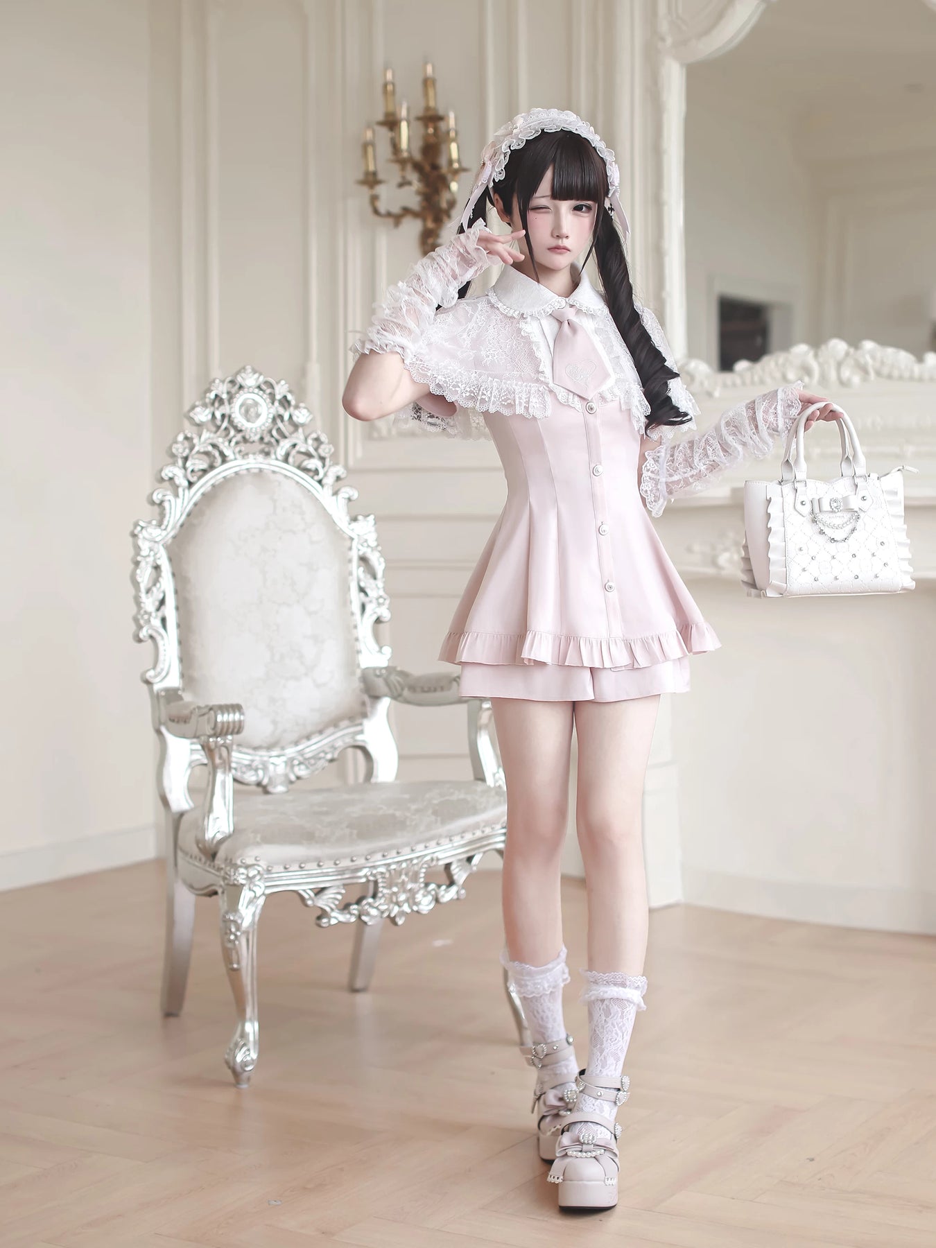 • Jirai Kei Dress: Lace ruffled Peter Pan collar with lace faux two-piece shawl, plus detachable tie adds refinement.