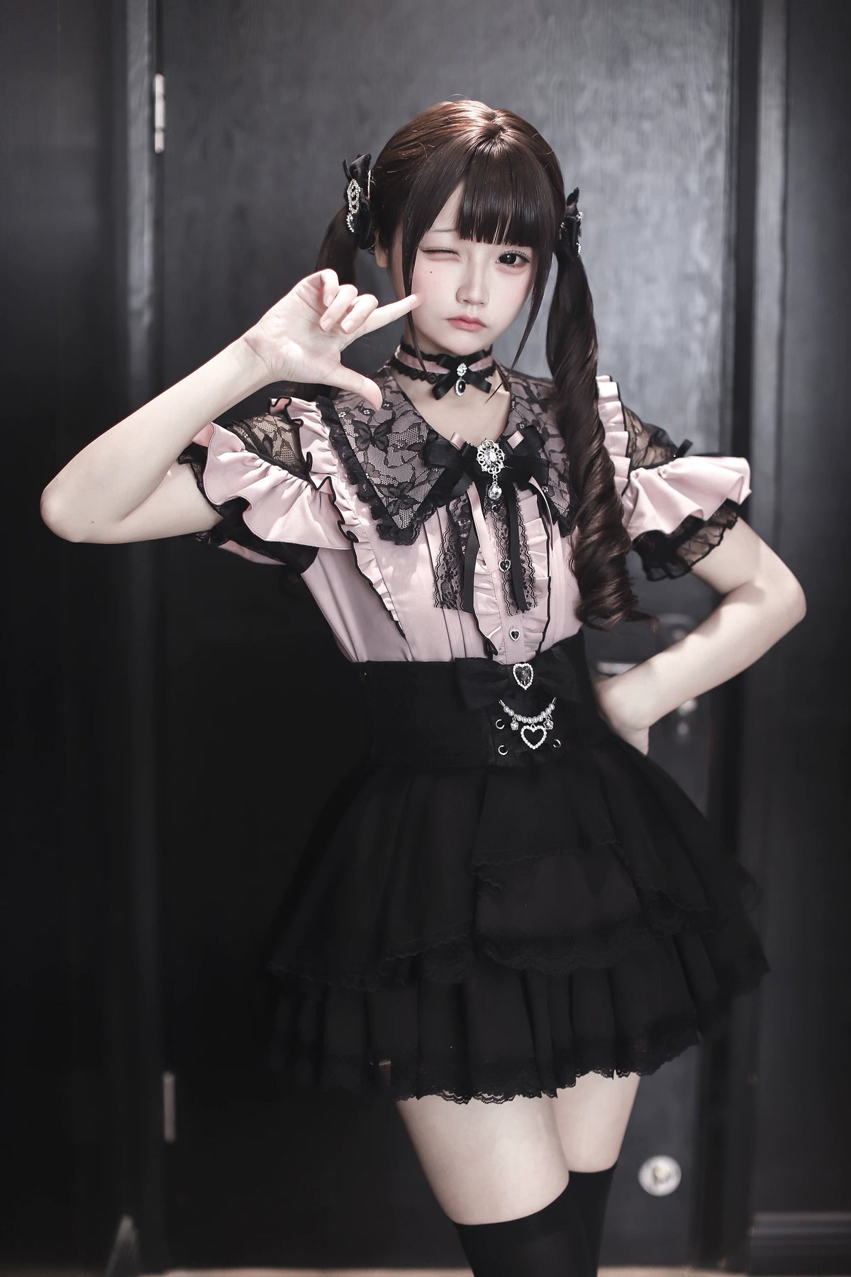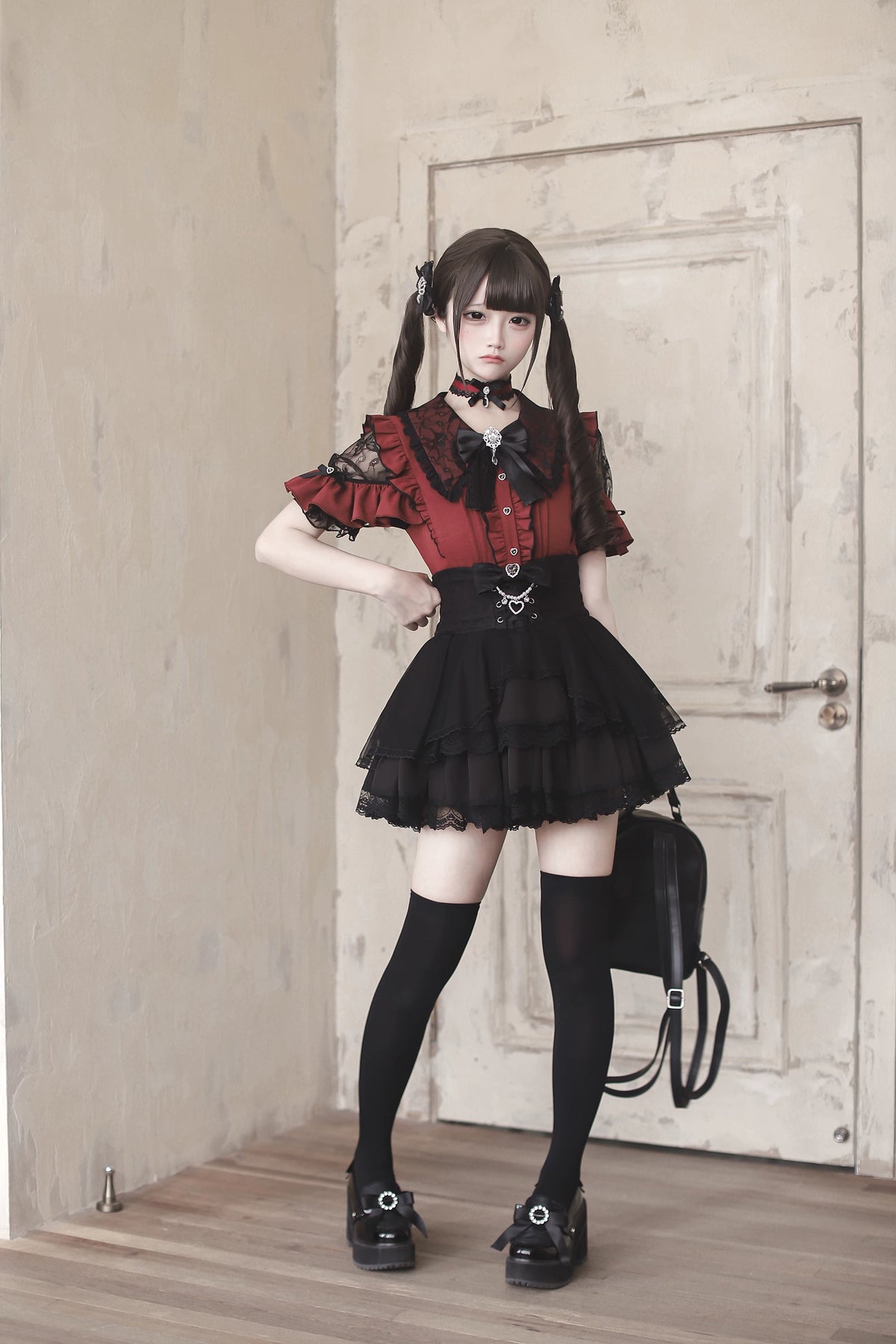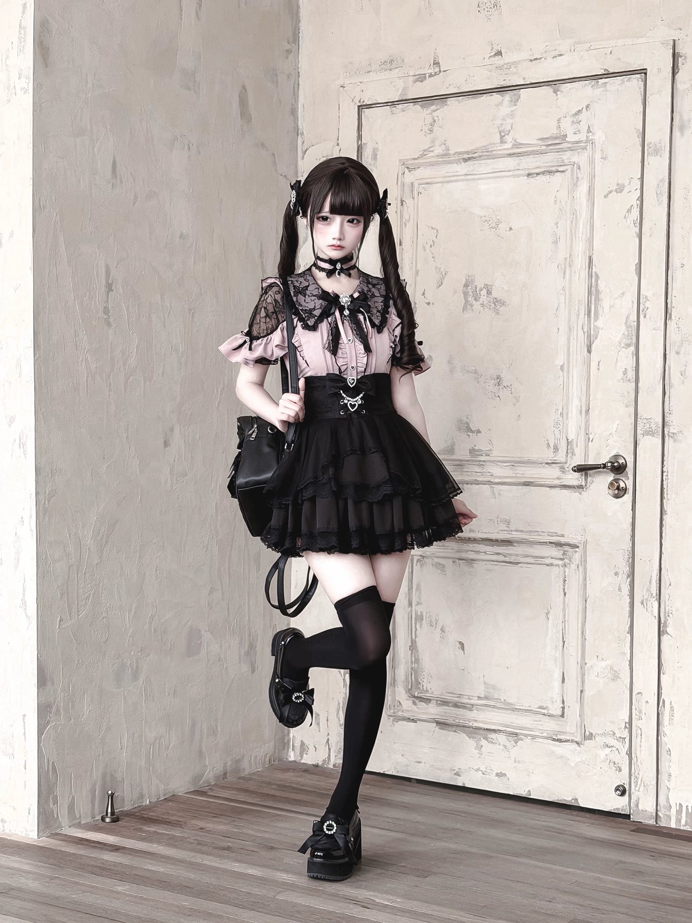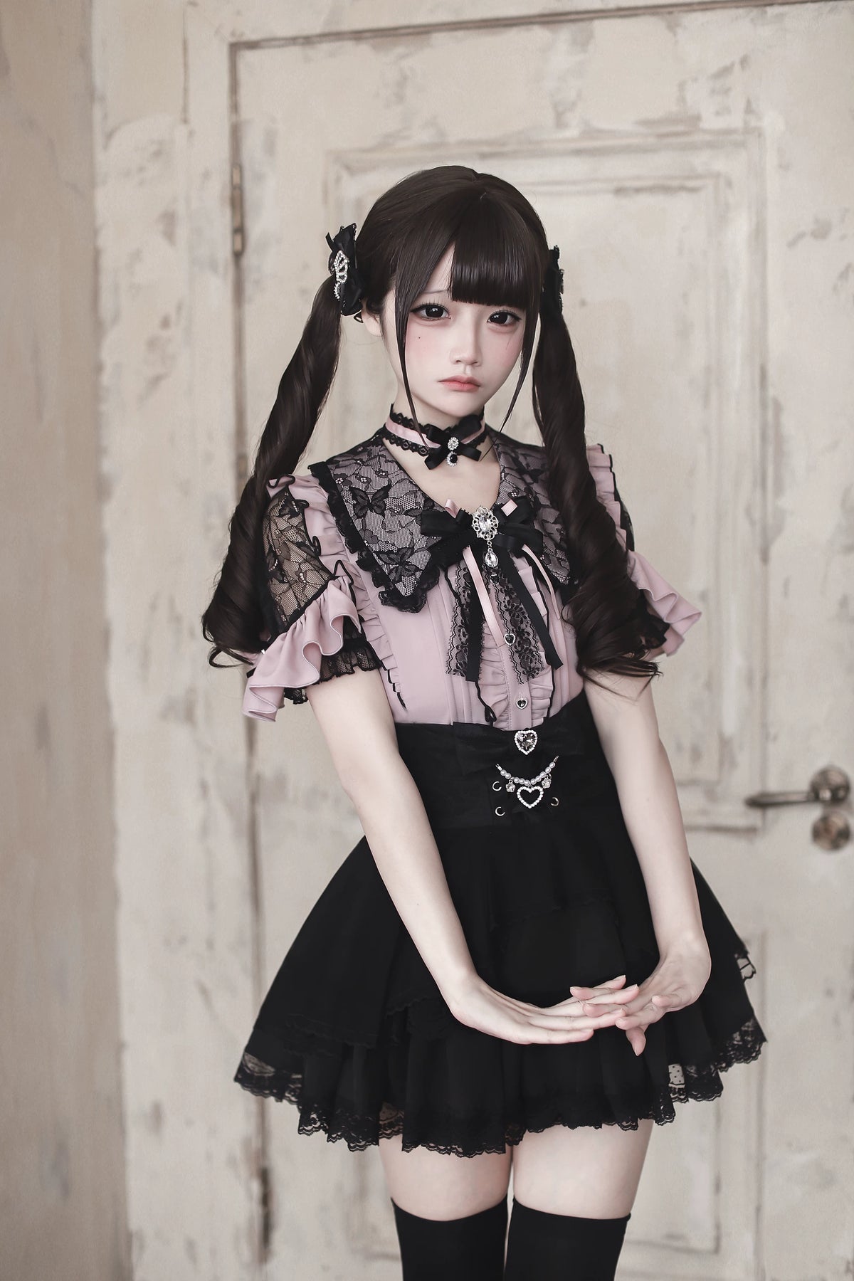 • Jirai Kei Blouse: Lace collar and sleeves, pintucks, and ruffles for layered charm, finished with heart-shaped buttons.