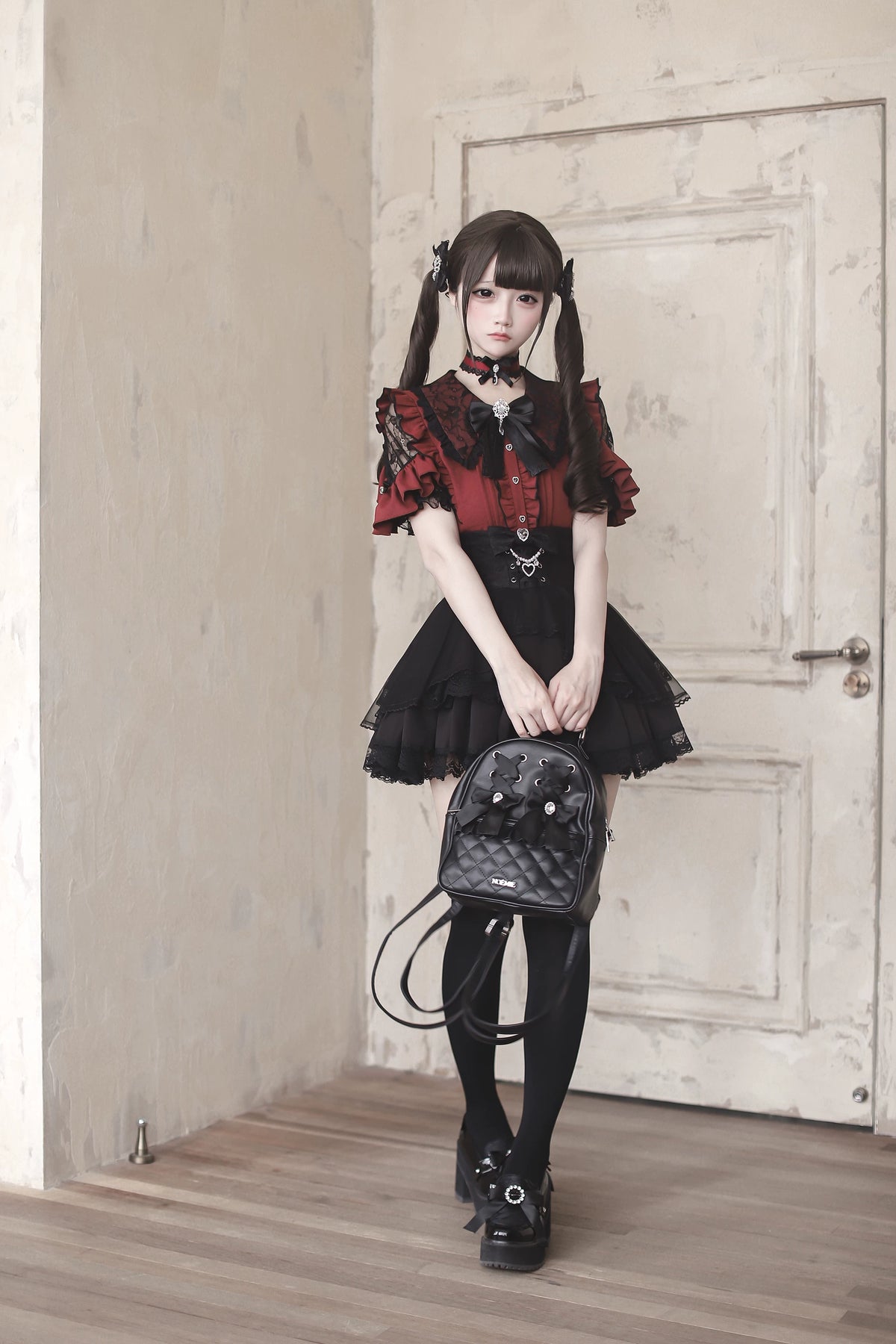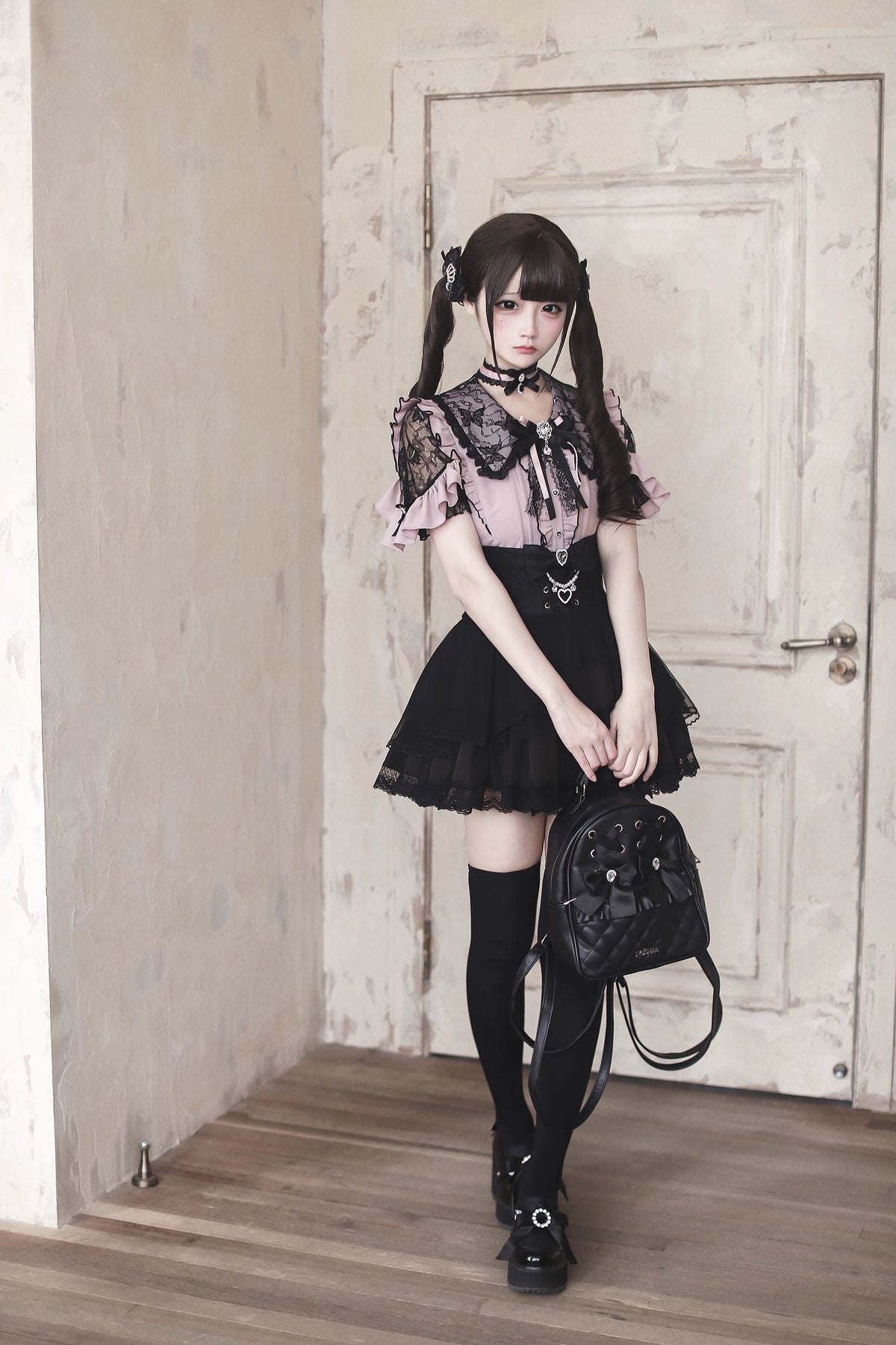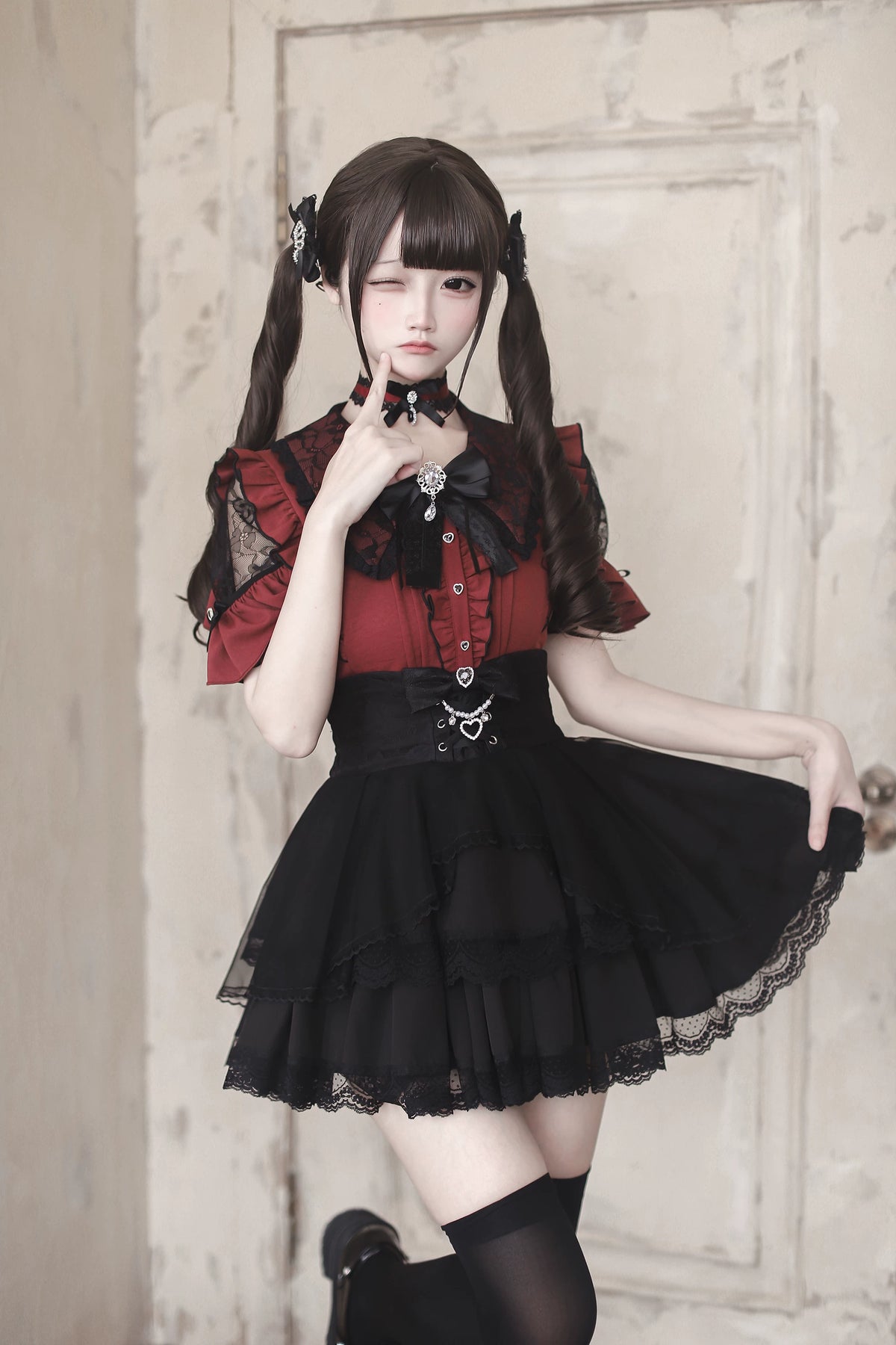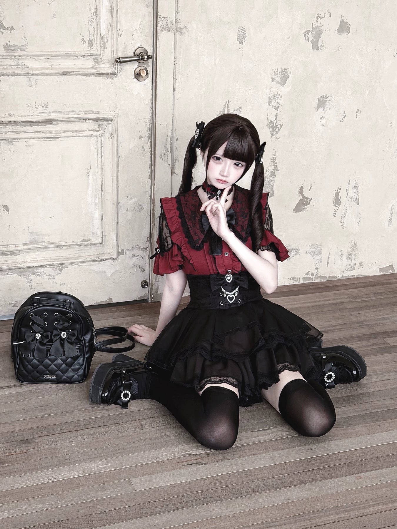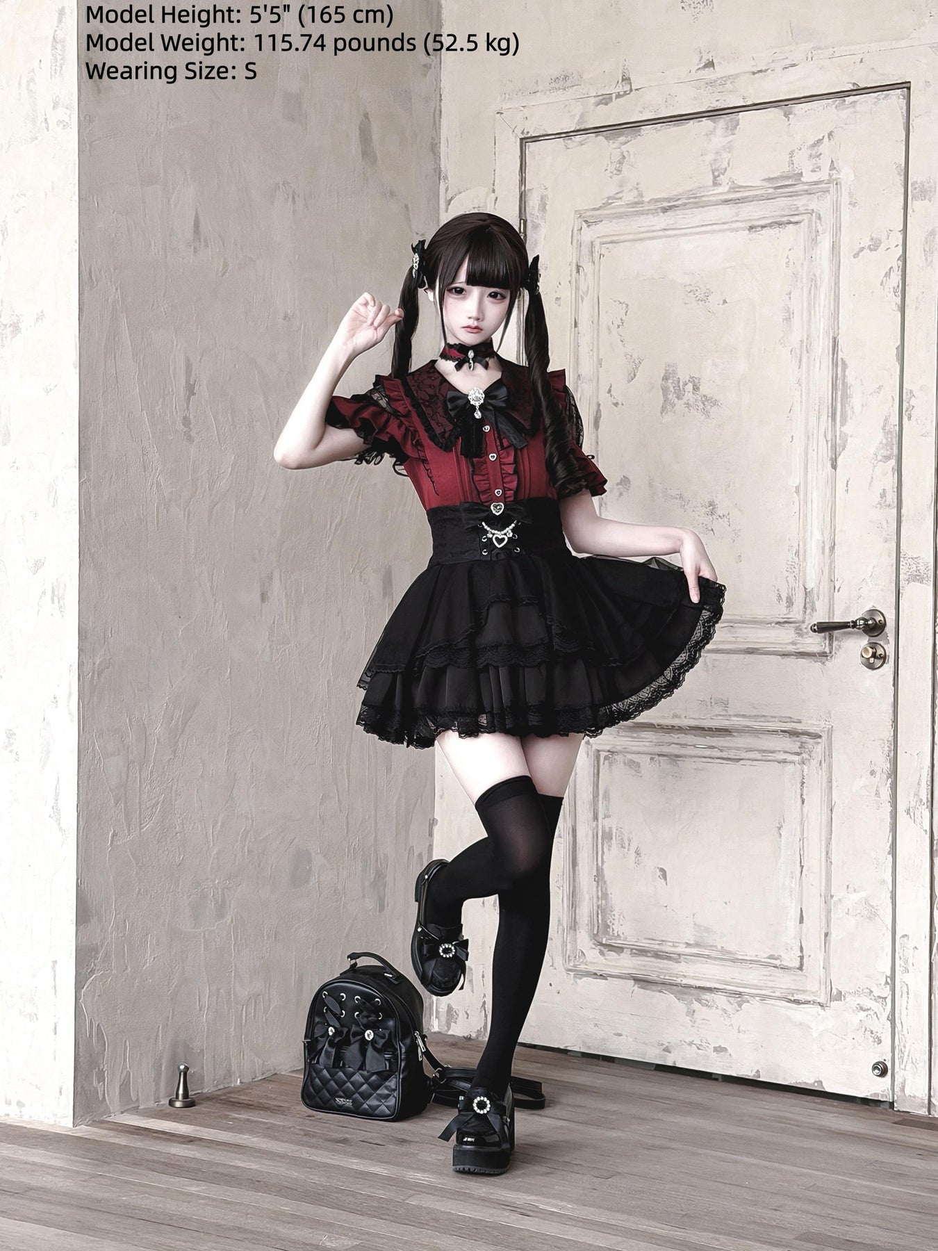• Jirai Kei Blouse: Lace collar and sleeves, pintucks, and ruffles for layered charm, finished with heart-shaped buttons.