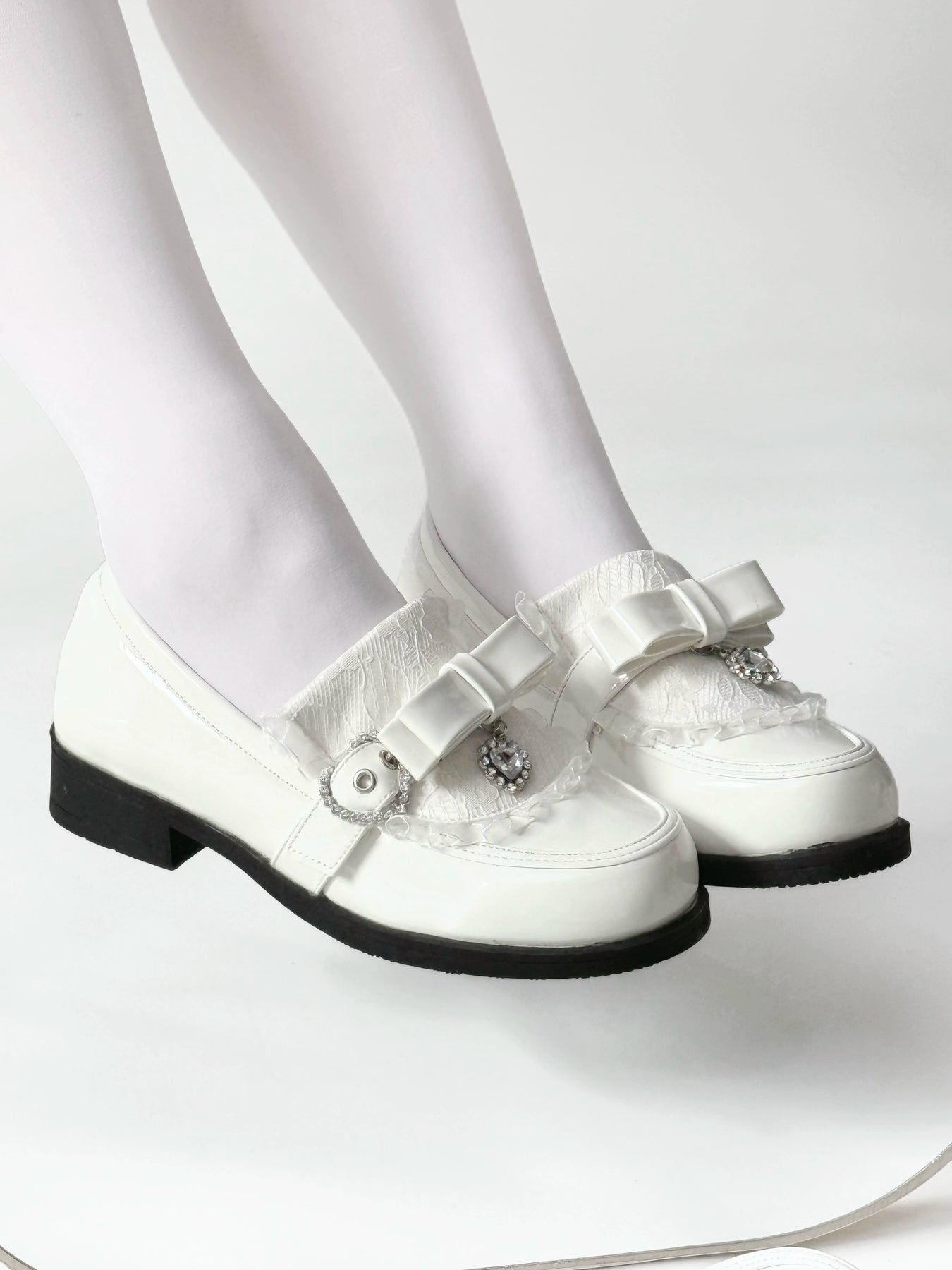 Jirai Kei Low-Heel Loafer Shoes, Rhinestones & Bow