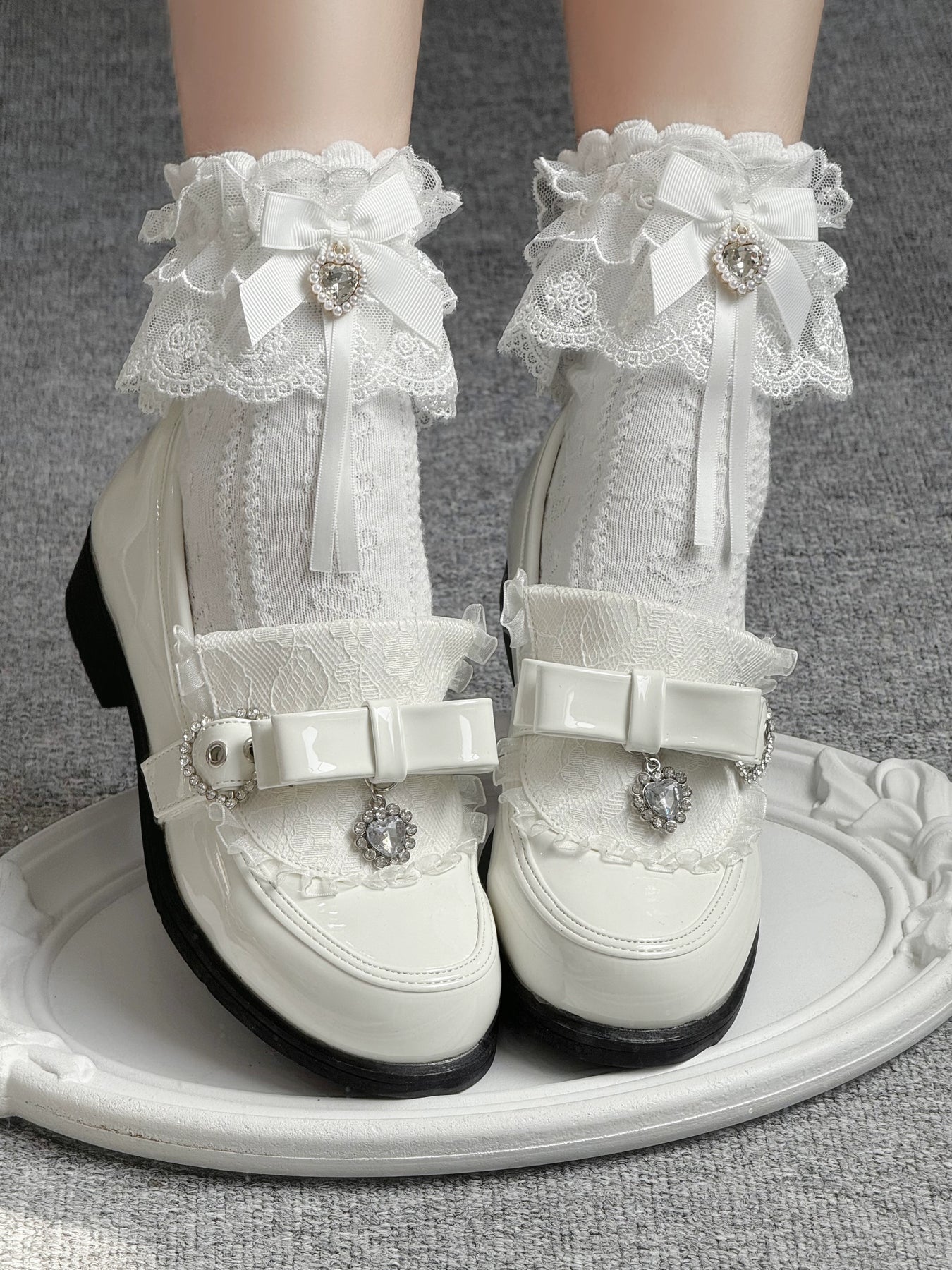 • Design Details: Lace cover on the surface; shiny bow decoration; rhinestone accents.