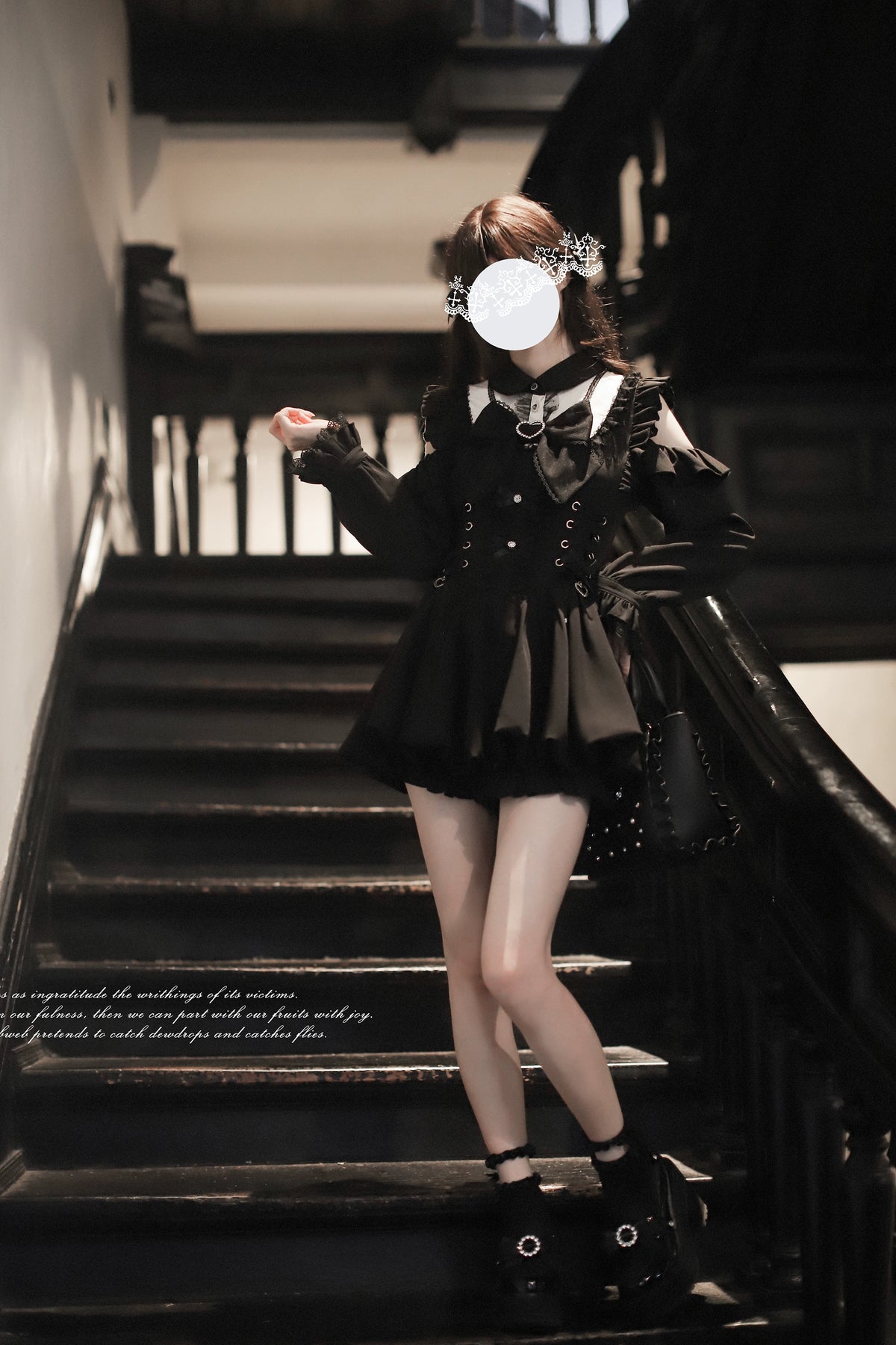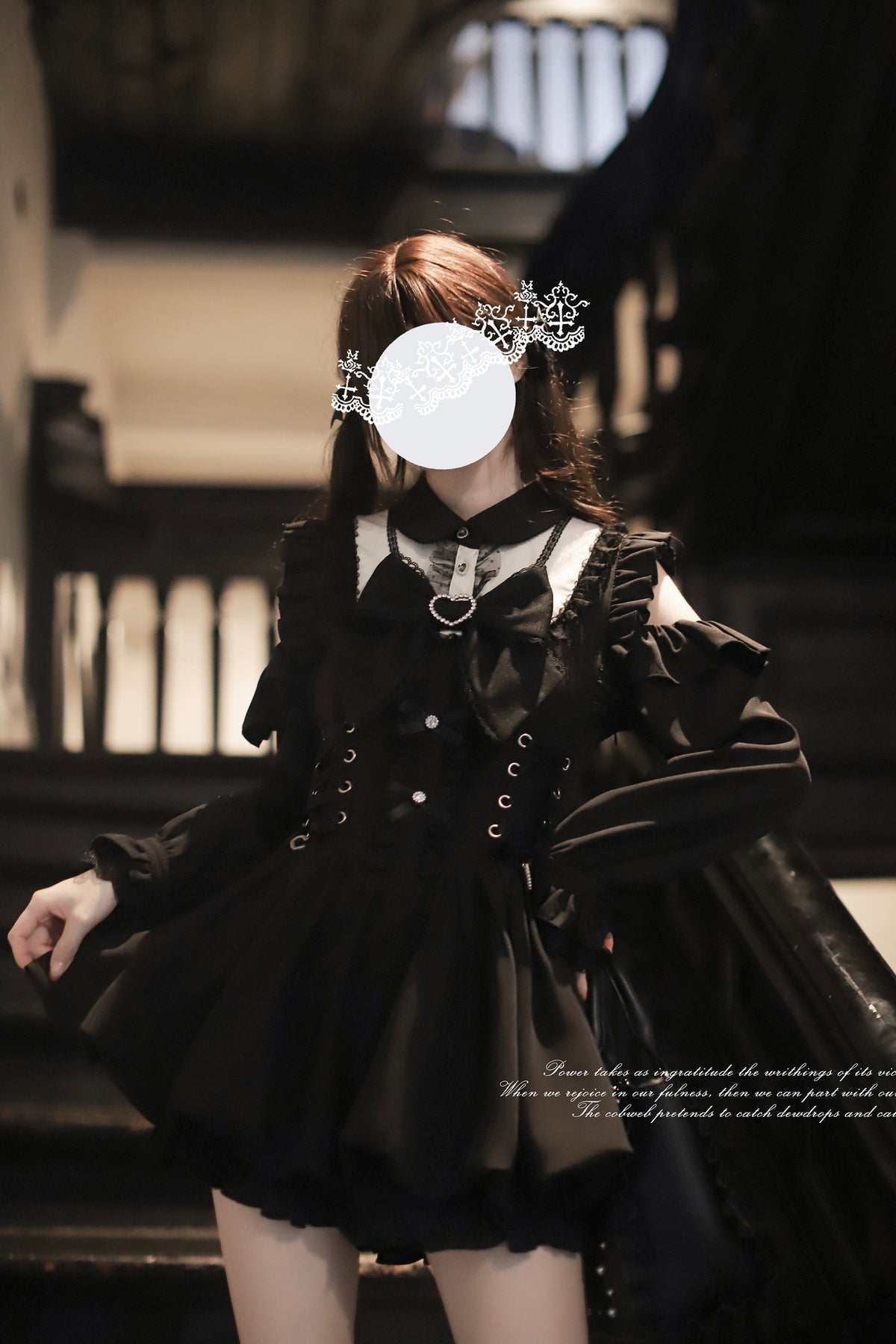 • Design Highlights: Sweet Peter Pan collar with buttons, waist-defining lace-up detail, and shimmering rhinestones with ribbon bows.