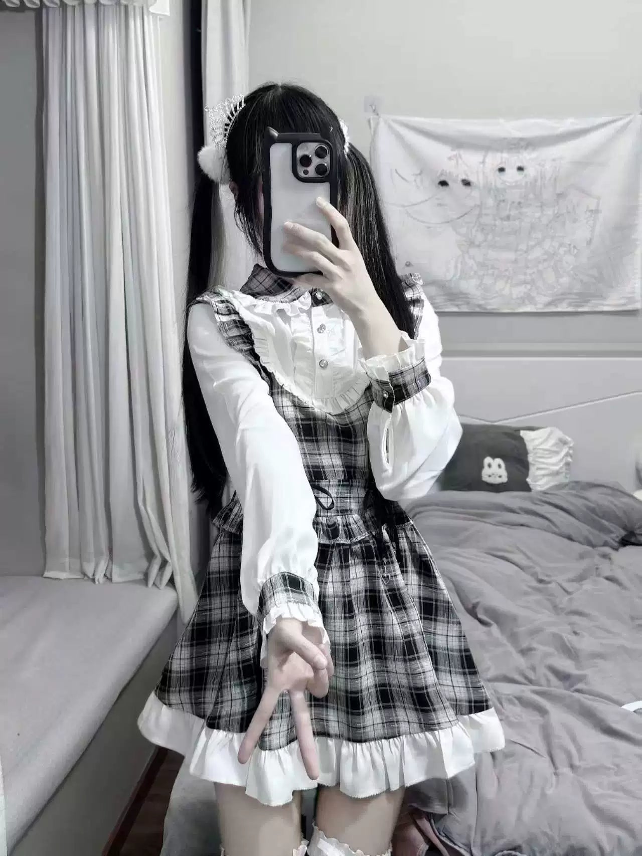 • Jirai Kei Dress: Peter Pan collar, classic black and white plaid accent, spliced with white ruffles, cute and sweet-cool.