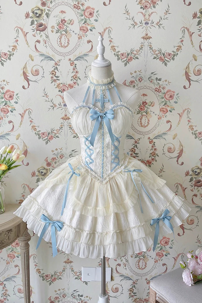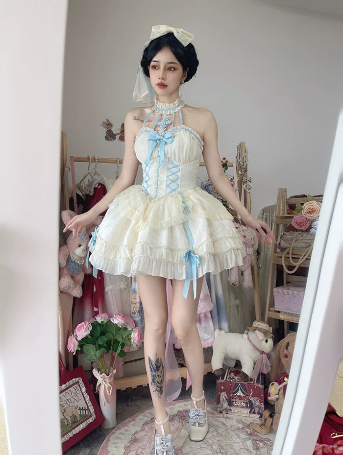 • The slim bodice, highlighted by corset lacing, ensures a tailored, flattering silhouette, while the lace-up back and delicate white bowknots adorning the flounce hemline weave an enchanting narrative of elegance and romance.