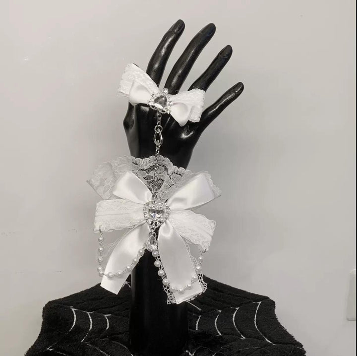 - This adjustable bracelet features delicate lace and satin bow decoration, adorned with a charming heart-shaped rhinestone. The chain is connected with an elastic cord ring, making it easy to wear and pair with any hairstyle and outfit.
