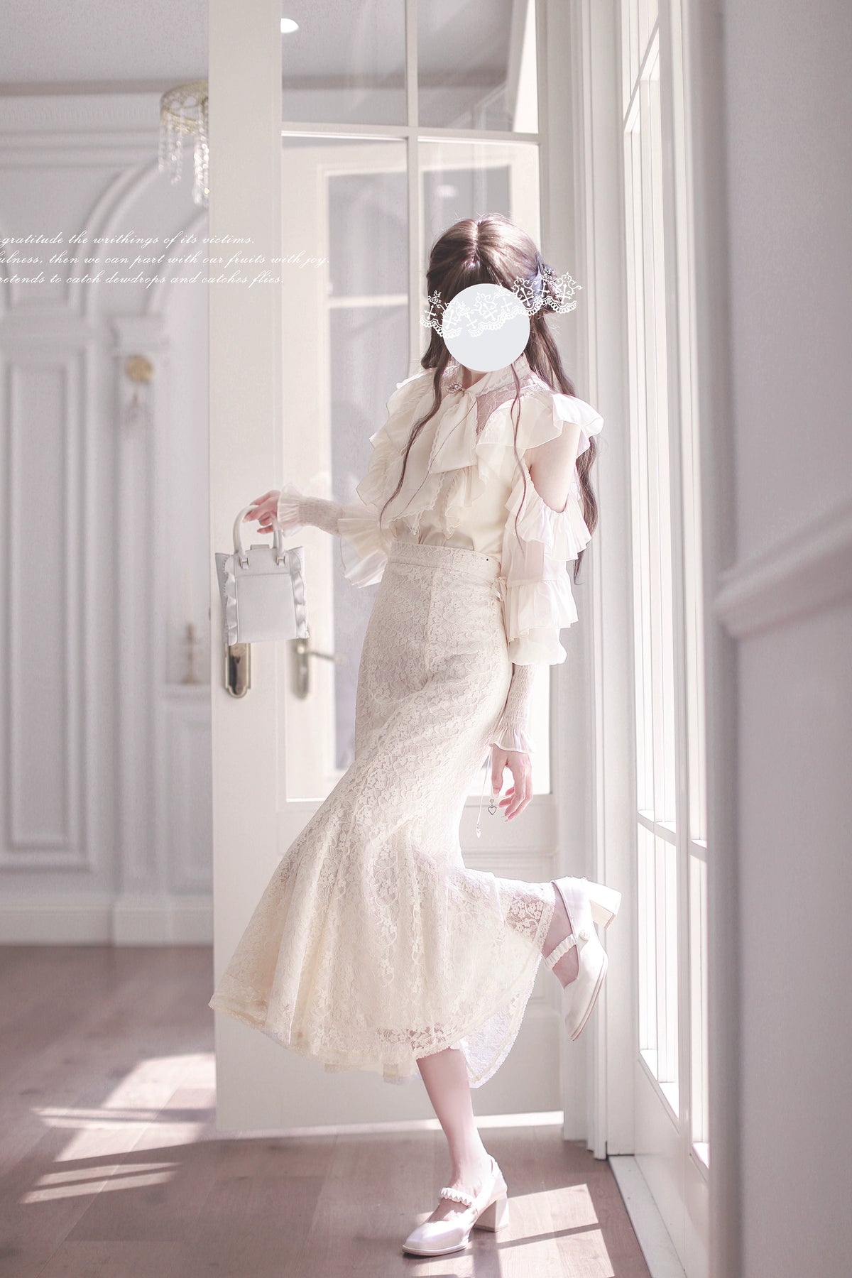 Elegant Open-Shoulder Blouse, Lace Mermaid Skirt 44039:793645