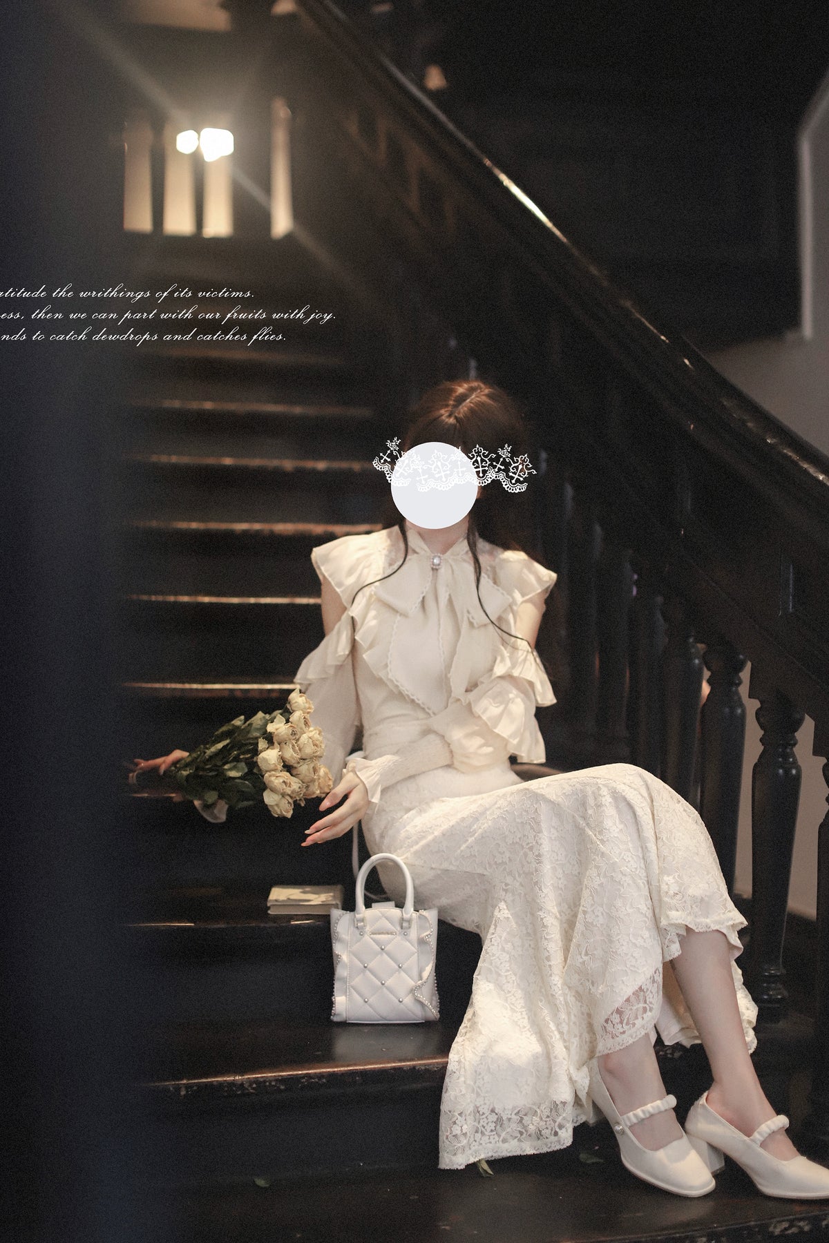 • Skirt: Outer layer covered in lace with flower patterns; ribbon details on both sides of the waist for a light and flowing feel.