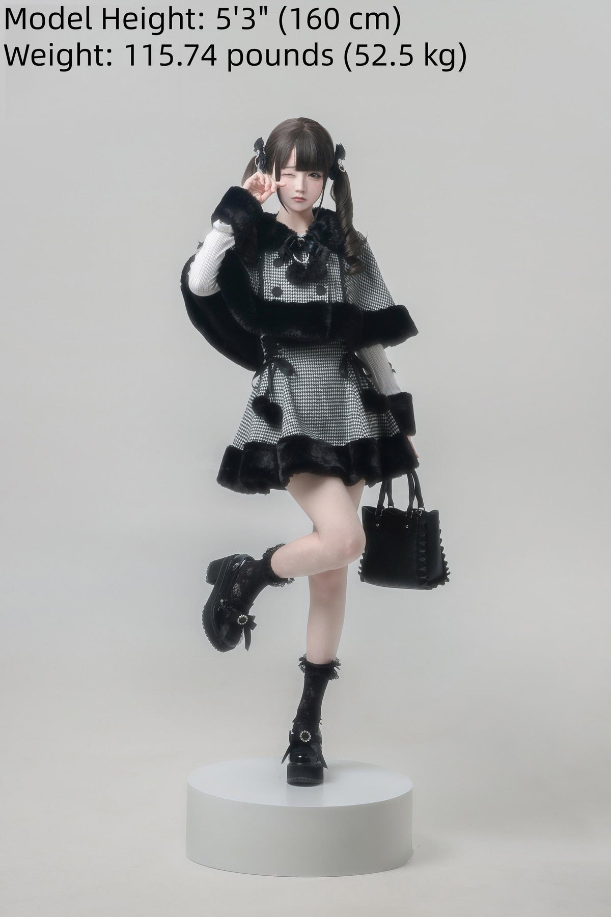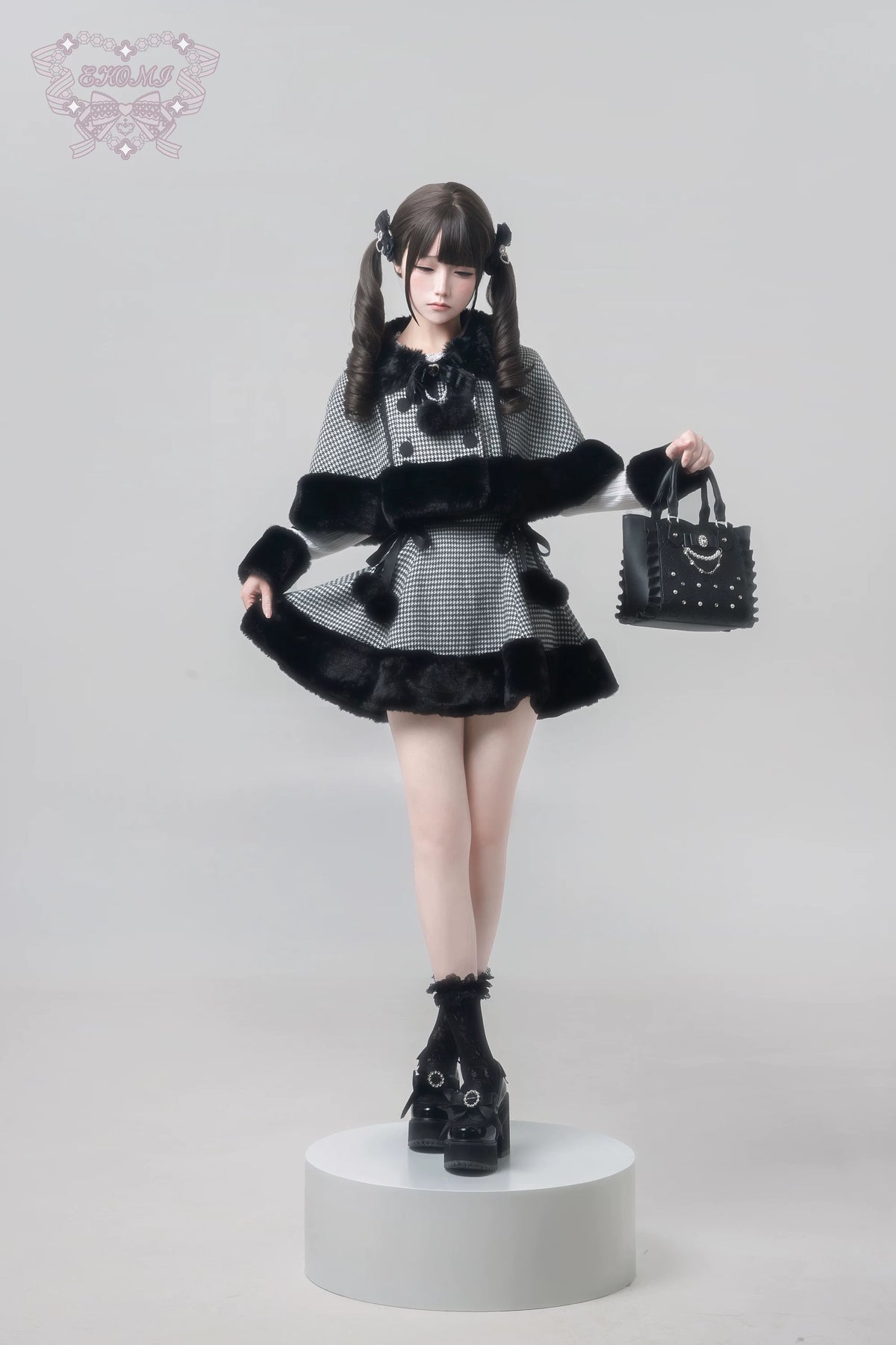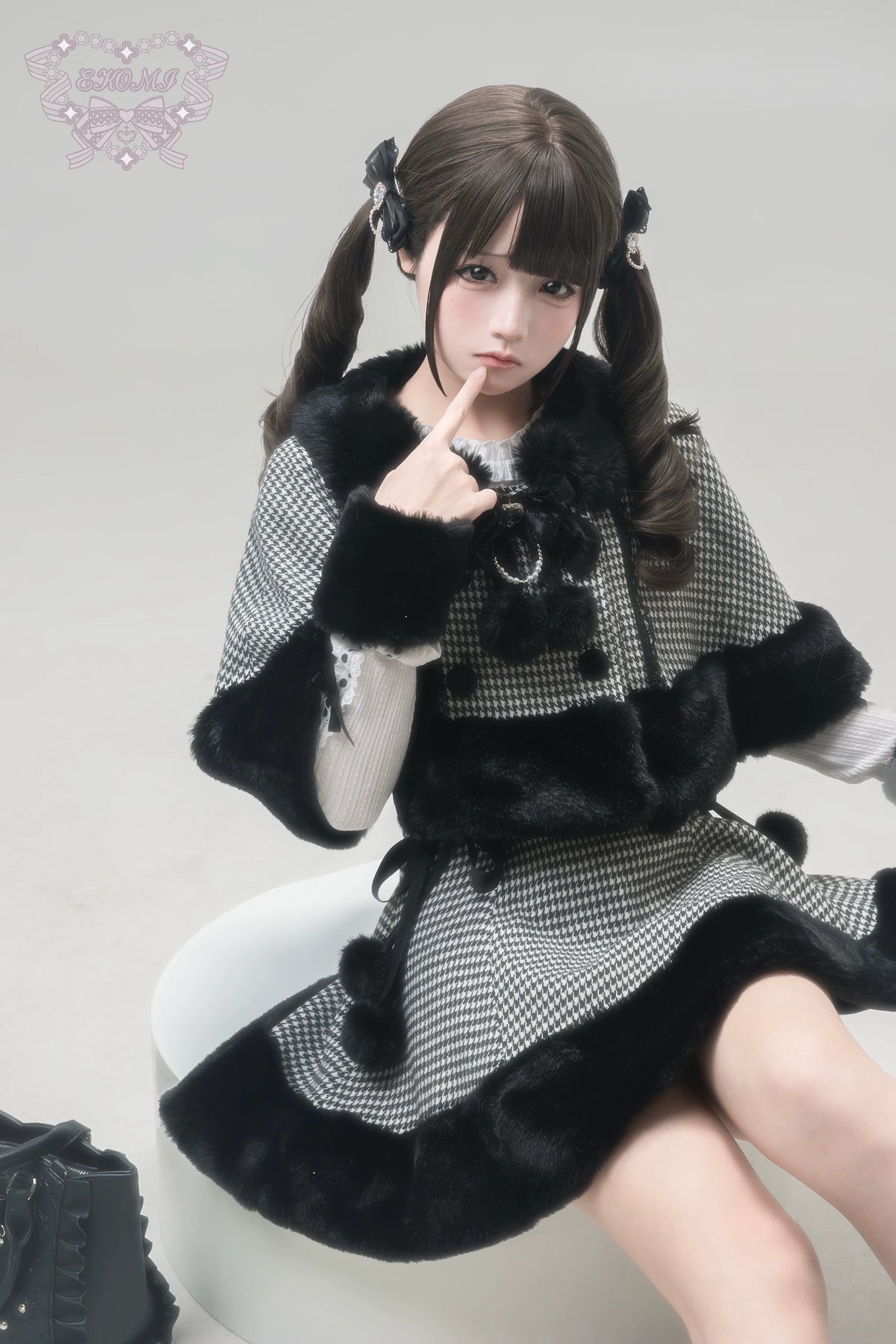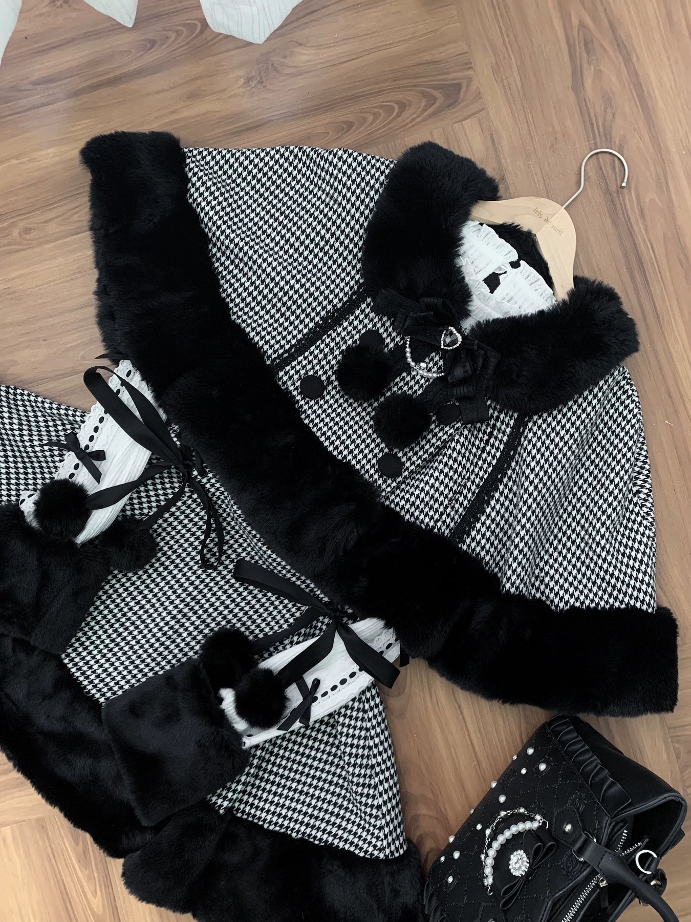 Houndstooth Jirai Kei cape set with black fluffy trim and pom pom decorations, perfect for winter style.