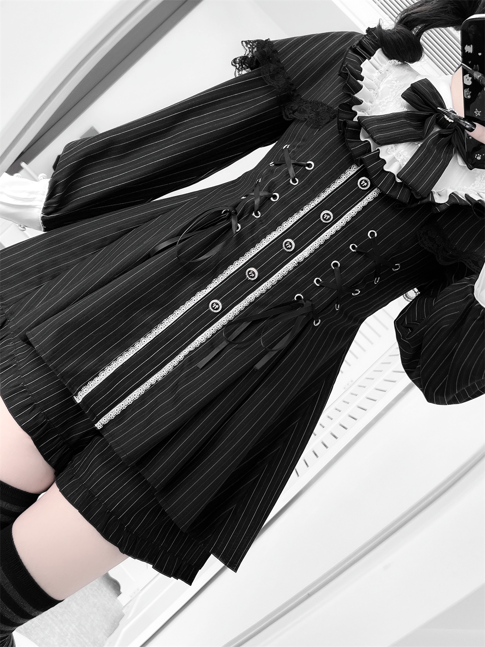 • Dress: Back zipper for easy wear, adjustable back waist tie, front lace-up detail, and detachable bow at the collar.