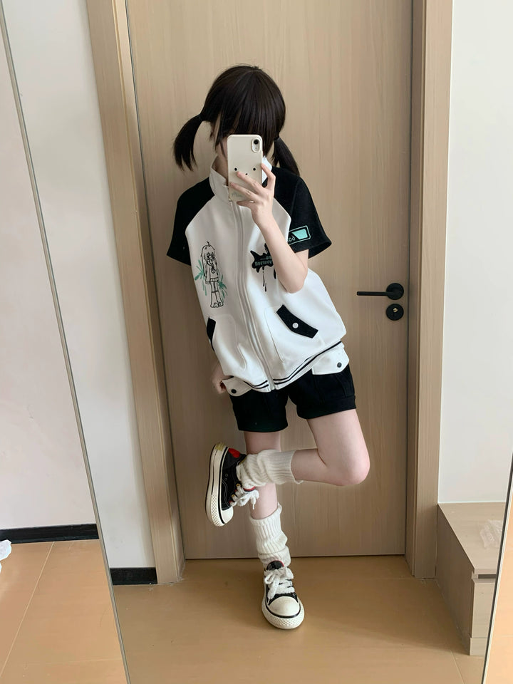 - This Jirai Kei sporty short-sleeved jacket and shorts set features a classic black and white color scheme, with Otaku-style prints that showcase your taste and personality.
