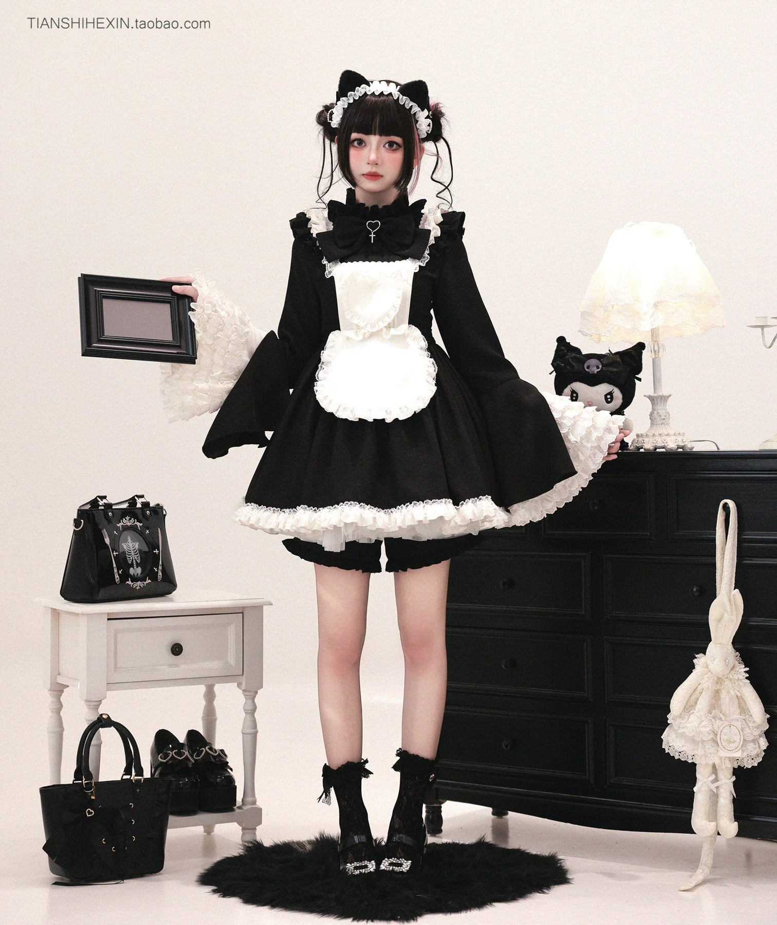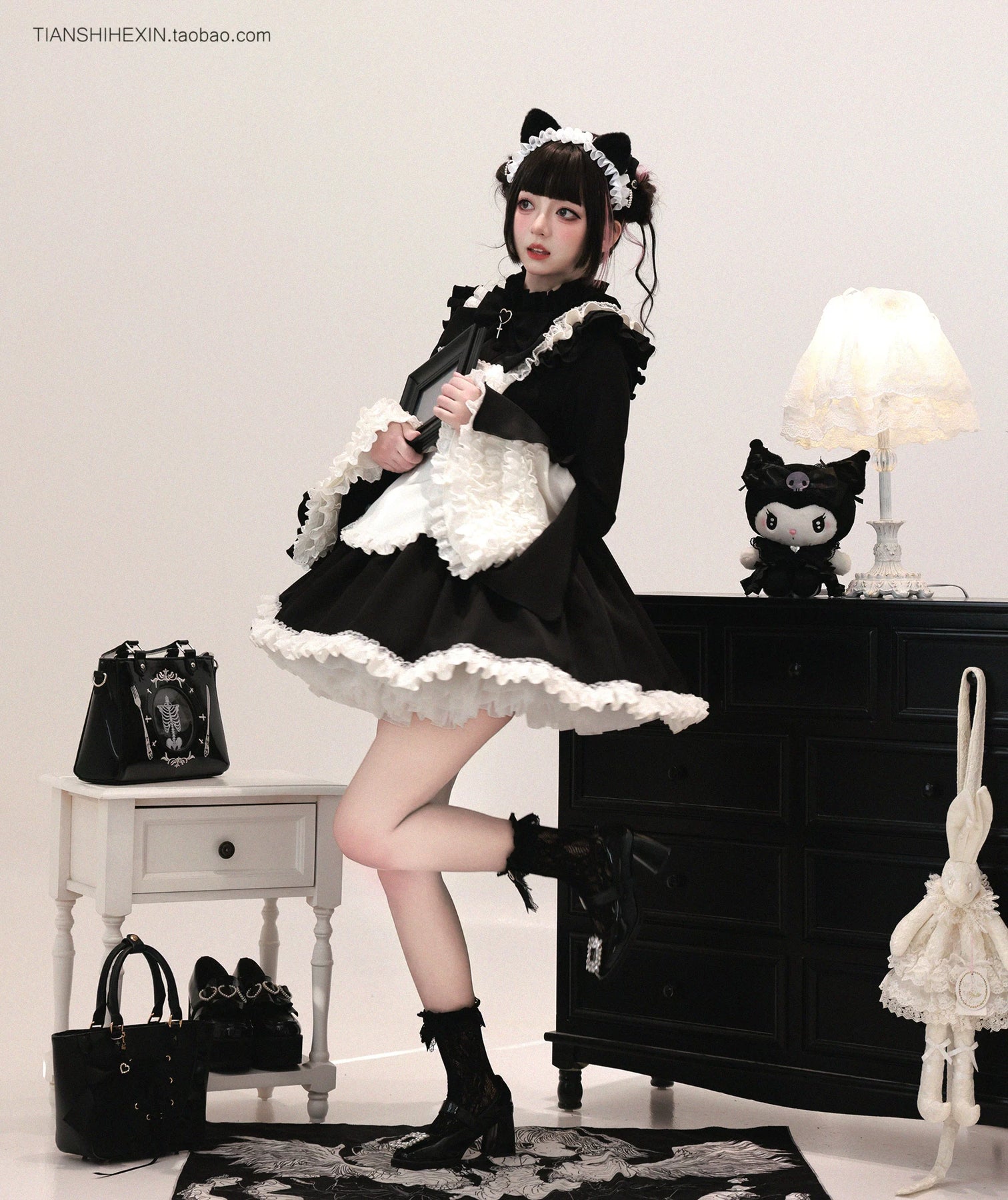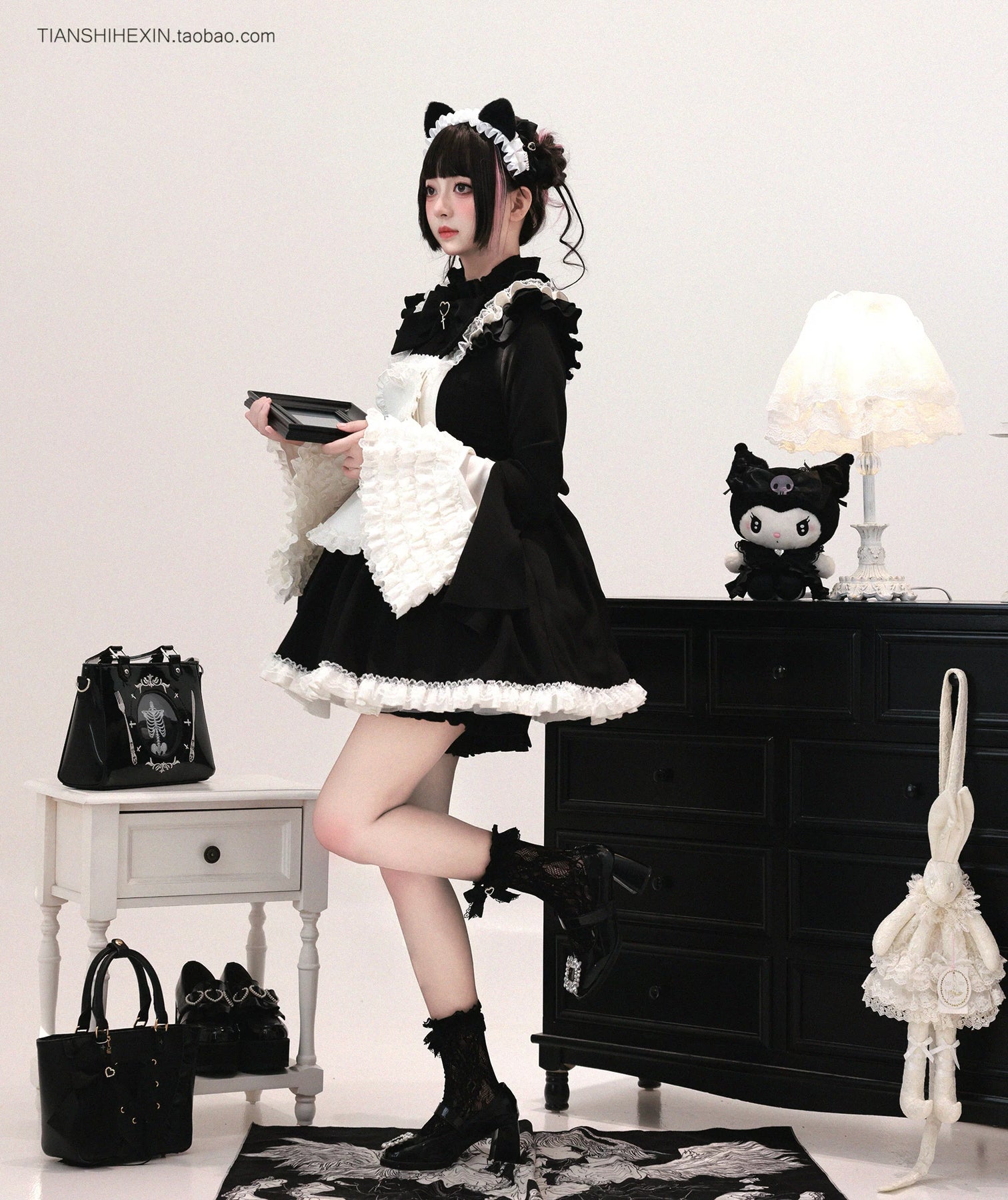 Maid-inspired Dress: High-waist fit with small princess sleeves, featuring sweet and cute printed patterns or classic black-and-white simplicity.