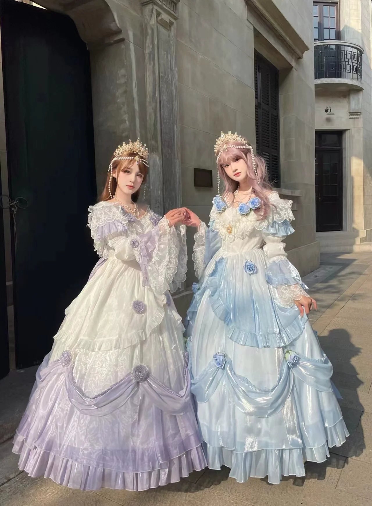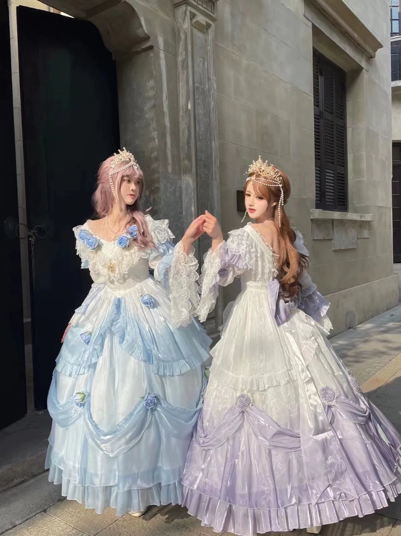 The faux slit skirt adds a subtle layered effect, while the flowing mantle, connected by handcrafted roses, completes the regal aesthetic.