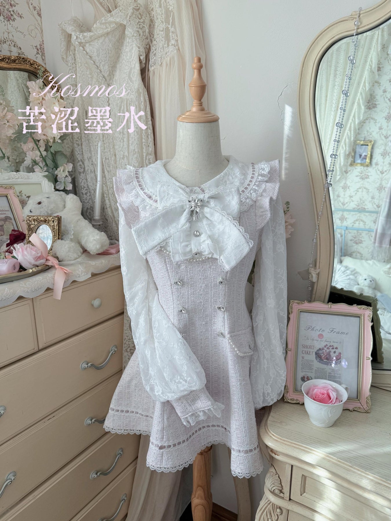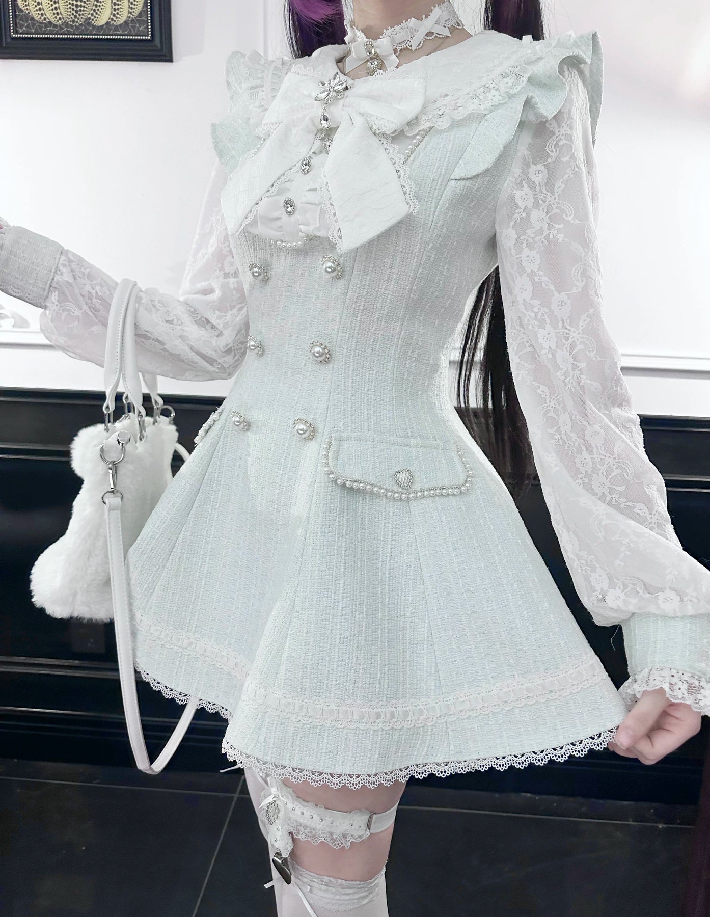 • Ryousangata Set Up: Peter Pan collar, lace sleeves, slightly flared skirt with ruffles and rhinestone details, romantic and gentle look.