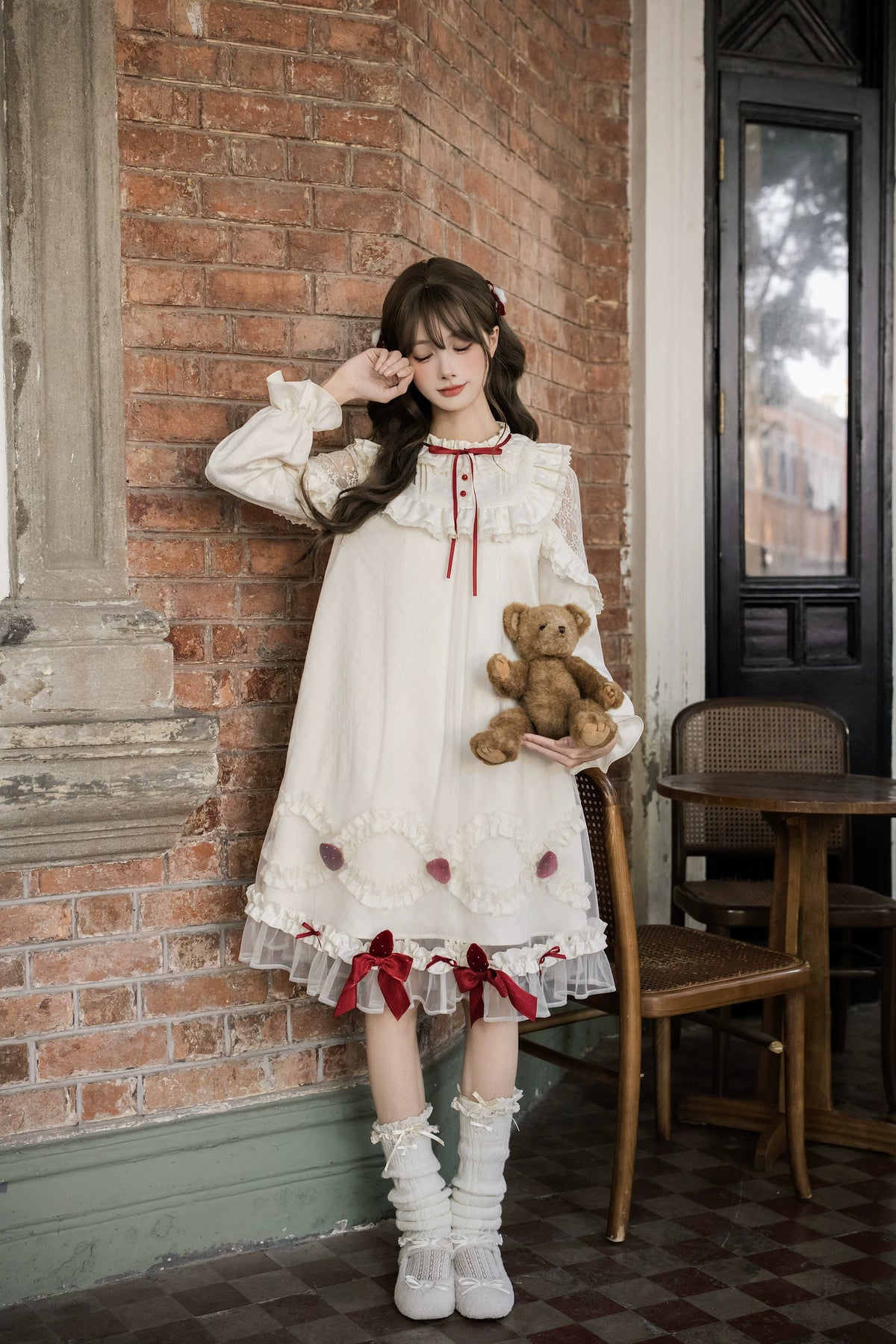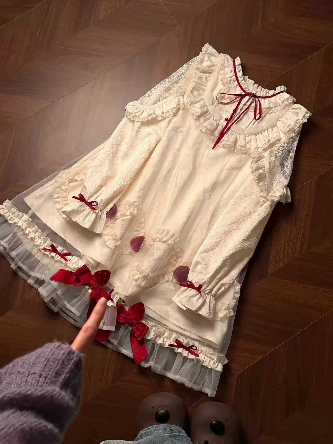 • Dress Details: Ruffled collar with red ribbons, lace shoulder accents, and a sheer overlay at the hem for a soft, dreamy look.