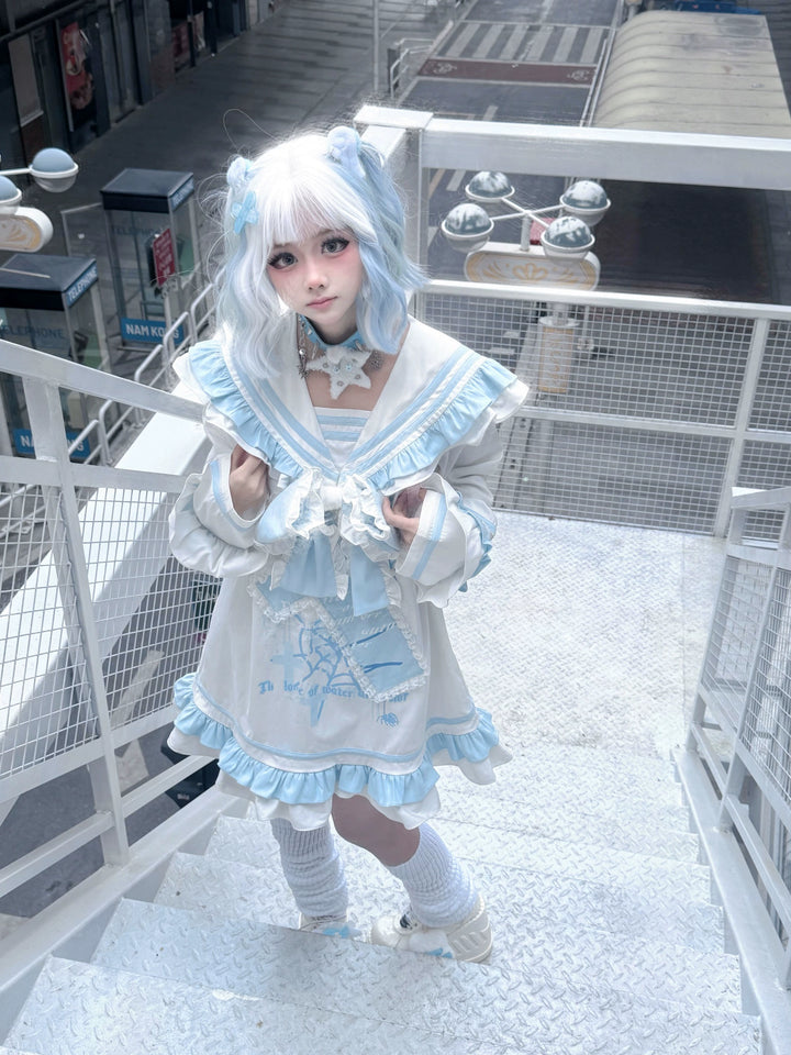 - Discover the charm of Yami Kawaii with this enchanting blue-and-white dress, featuring a sailor collar, tiered ruffles, and a delicate bow. Perfect for fans of whimsical aesthetics or a special foray into the Tenshi Kaiwai style.