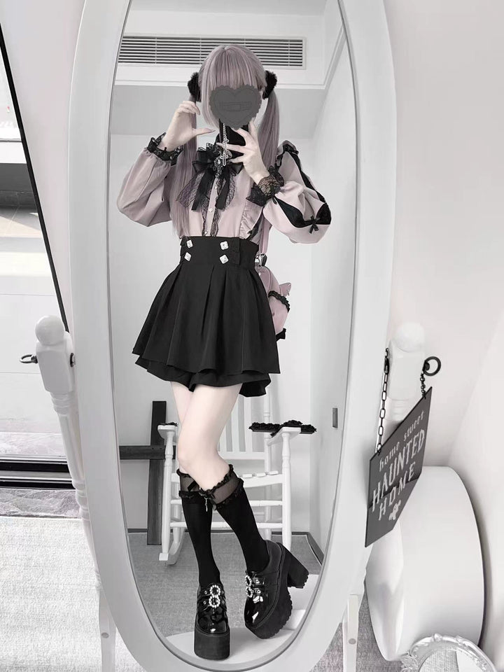 - Blouse: Designed with a lace collar, detachable bowtie, belt detail on the shoulders, and unique patchwork sleeve design.
