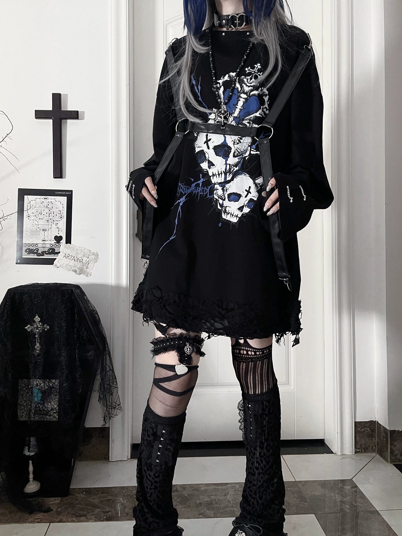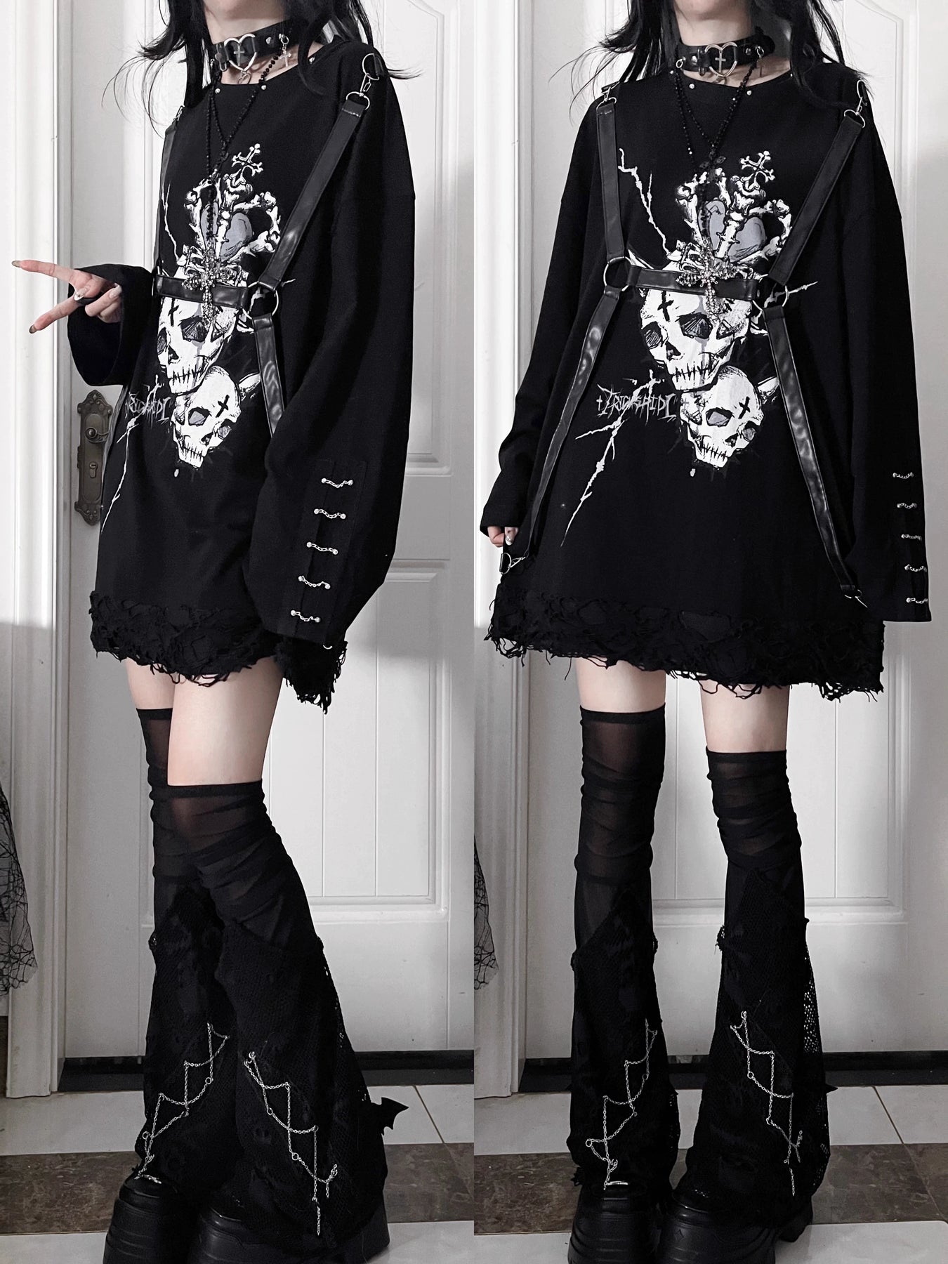 Gothic Printed Long Sleeve Tee, Detachable Strap