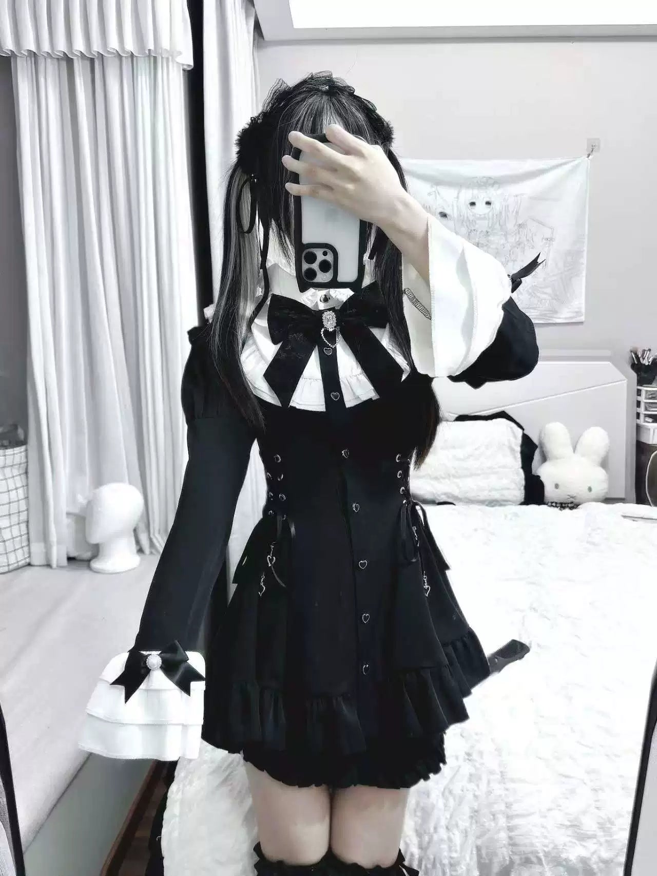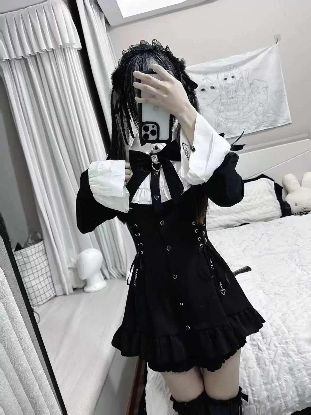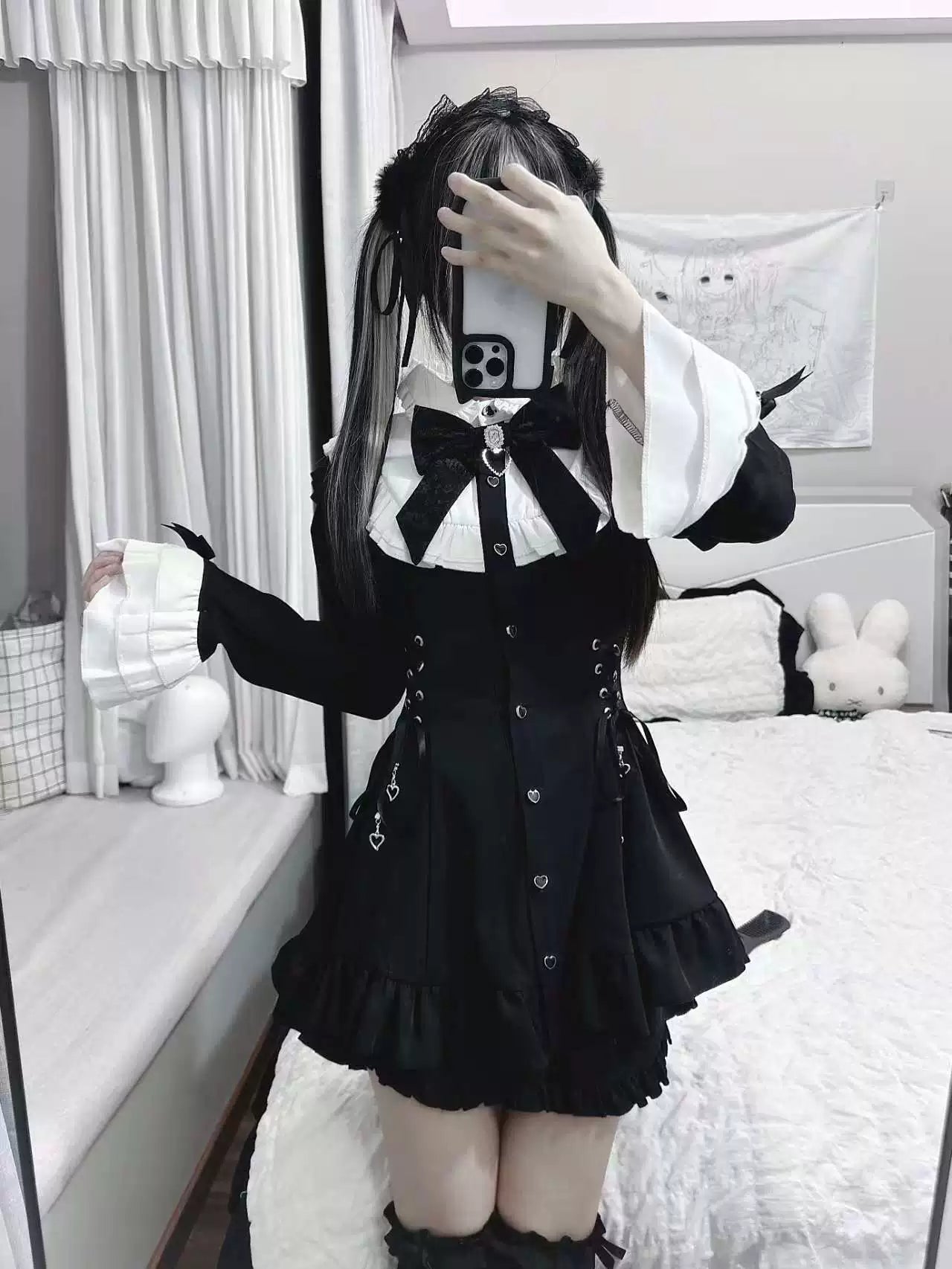- Jirai kei Outfit: Timeless black and white color scheme, decorated with heart-shaped pendants, for a classic Japanese style.