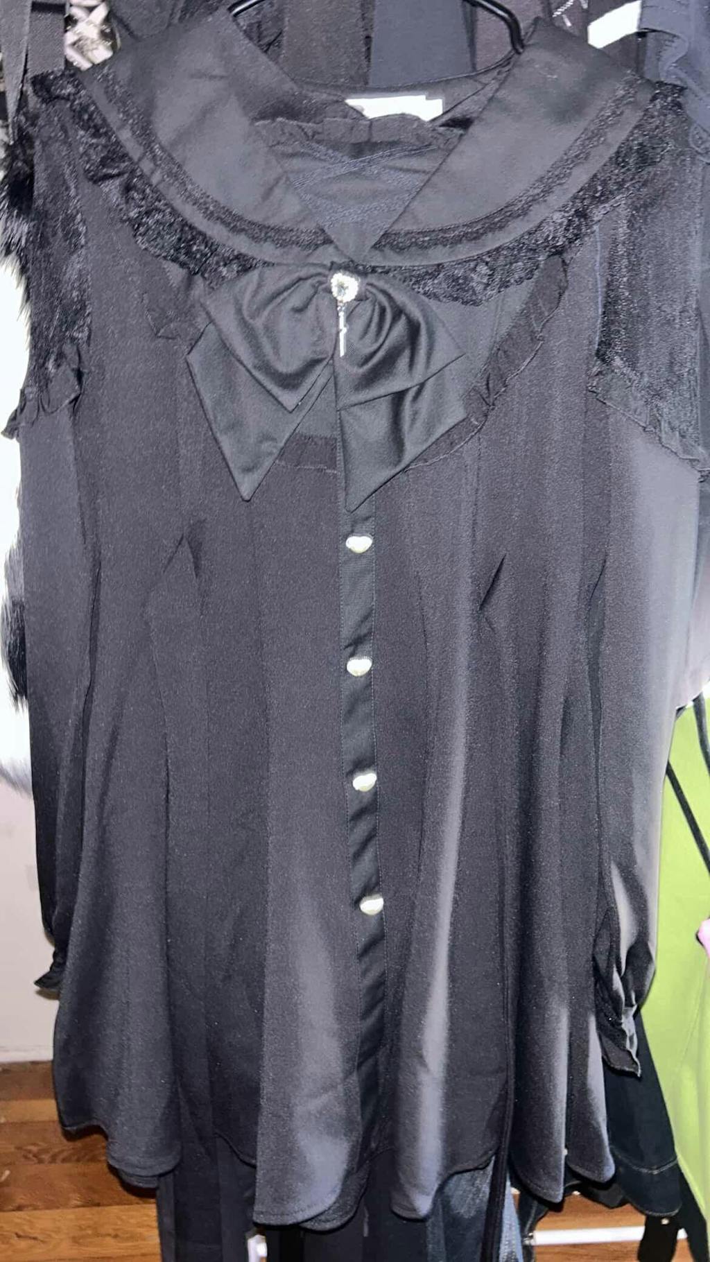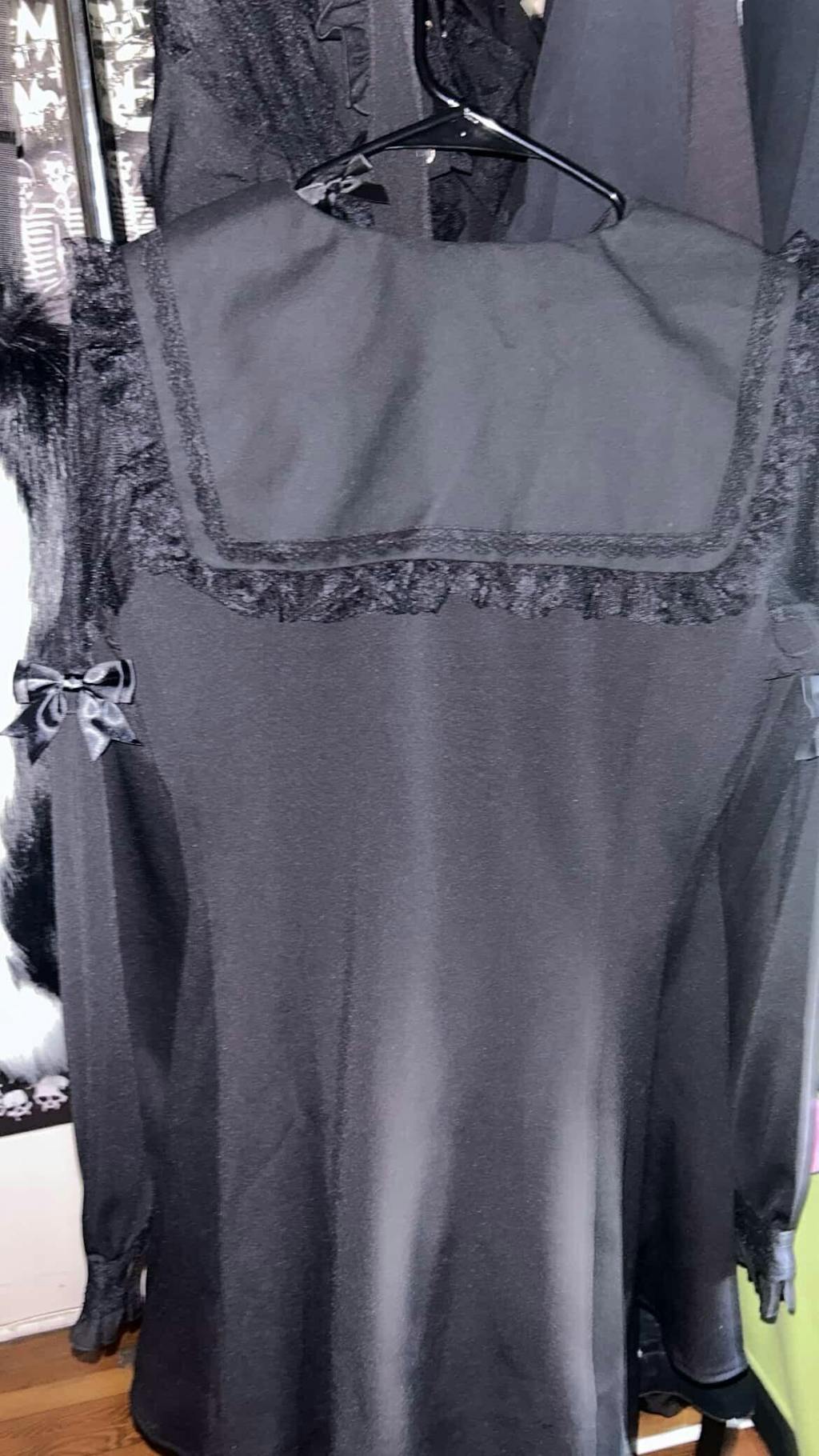 • This Jirai Kei dress features intricate black lace details around the neckline and sleeves. It comes with a removable bowtie with a rhinestone pendant for added charm.